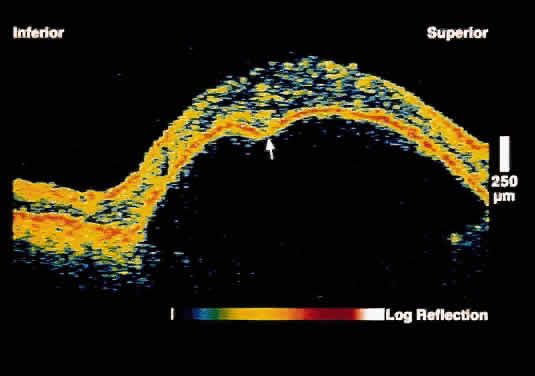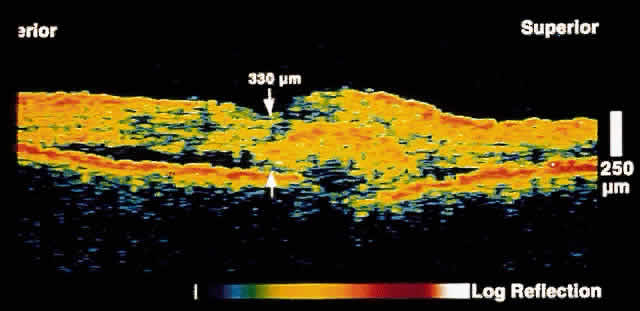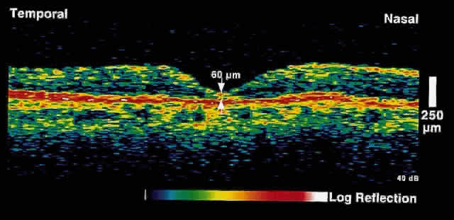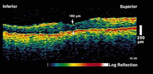sclera are all well delineated. The posterior aspect of the neurosensory retina is bounded in the OCT images by a highly reflective red layer about 70 microns thick that represents the choriocapillaris and retinal pigment epithelium (RPE) layer. In vivo choriocapillaris thickness by OCT is greater than that of histologic sections because of postmortem blood depletion and artifacts in tissue processing. The high contrast between the choriocapillaris/RPE layer and the neural retina in OCT images provides a useful boundary for use in measurements of retinal thickness. Retinal blood vessels are evident in OCT images by their shadowing of deeper retinal structures. The region just anterior to the choriocapillaris/RPE layer is typically weakly reflective and corresponds to the photoreceptor layer. The highly reflective red layer at the inner margin of the retina corresponds to the nerve fiber layer. In the OCT image taken along the papillomacular axis (see Fig. 1), the thickness of the nerve fiber layer increases from the fovea to the optic disc. Circular tomographs taken around the disc demonstrate modulations in thickness consistent with the superotemporal and inferotemporal bundling of the nerve fibers. Because retinal detail is so exquisitely imaged by OCT, this imaging modality can be applied to a large number of clinical entities. |