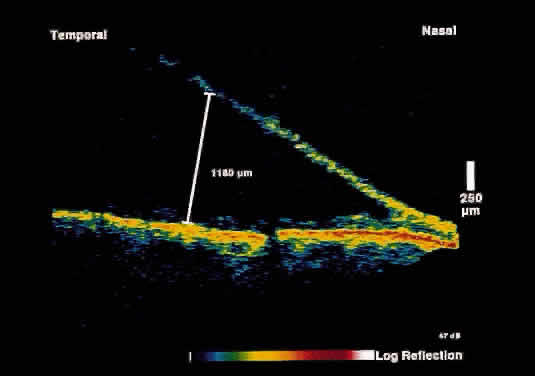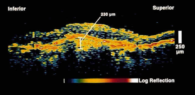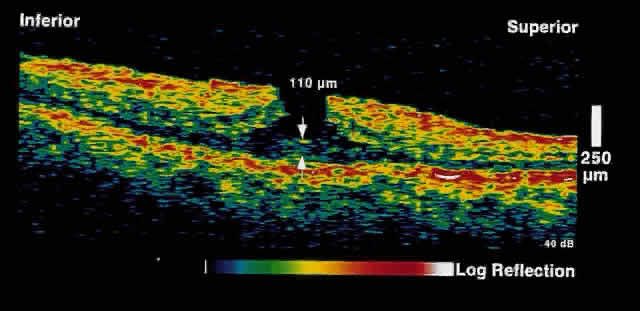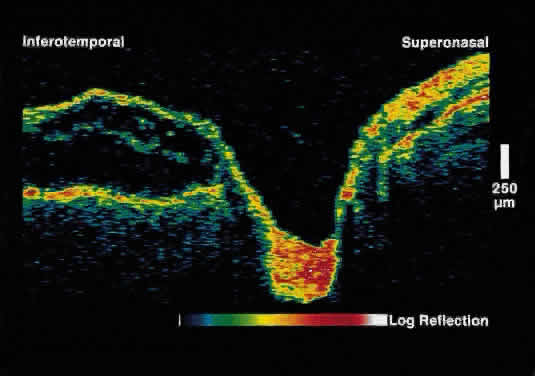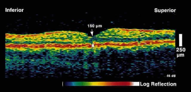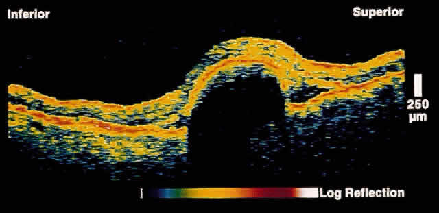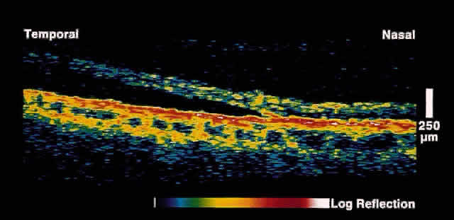 Cystoid macular edema is characterized by fluid accumulation in intraretinal cystic spaces. This may be from a variety of causes, including diabetes, venous occlusion, cataract surgery, and inflammatory disease. OCT images demonstrate cystic areas of decreased reflectivity within the neurosensory retina consistent with the known histopathology of this entity. Again, the ability to quantitate the extent of thickening is useful not only in the diagnosis of this disease but also in assessing the response to treatment (topical medications, periocular steroids, vitrectomy). Age-Related Macular Degeneration In the imaging of macular pathology from age-related macular degeneration, OCT has clinical utility in several areas. As described above, OCT can help distinguish central serous retinopathy from exudative age-related macular degeneration in older patients. Retinal edema from choroidal neovascularization, particularly when it involves the fovea, can have a profound effect on visual function. Because of its ability to measure retinal thickness accurately, OCT is useful in assessing the response to laser treatment for choroidal neovascularization. OCT can also differentiate among serous, hemorrhagic, and fibrovascular RPE detachments.16,17 Serous RPE detachments present as focal elevations of the reflective RPE band over an optically clear space (Fig. 7). The angle of the edge of the detachment is typically acute, probably because of tight adherence of RPE cells to Bruch's membrane at the edge of the detachment. Hemorrhagic RPE detachments are distinguished by a moderately reflective layer directly beneath the detached RPE, corresponding to the sub-RPE blood (Fig. 8). Fibrovascular RPE detachments, in contrast, demonstrate moderate reflectivity throughout the entire sub-RPE space (Fig. 9). This is probably the result of the lower scattering coefficient of the fibrovascular proliferation as compared to blood. OCT may serve as an adjunct to fluorescein and indocyanine green angiography in the classification of choroidal neovascular membranes. Choroidal neovascular membranes typically have one of three presentations on OCT: fibrovascular RPE detachment, well-defined, or poorly defined. The OCT presentations typically correspond to the angiographic classifications. Well-defined choroidal neovascular membranes on OCT appear as a fusiform thickening of the reflective band corresponding to the RPE/choriocapillaris. The thickening extends anteriorly on the OCT image, creating an elevation in the normally smooth contour of the RPE band. Poorly defined choroidal neovascular membranes on OCT images present as ill-defined, diffuse areas of choroidal reflectivity that blend into the normal contour of the RPE band; a distinct boundary cannot be ascertained. Perhaps of greatest interest is the ability of OCT to localize a choroidal neovascular membrane to either the subretinal or sub-RPE space. Thus, OCT may have utility in defining surgically approachable membranes in age-related macular degeneration as well as from other causes of choroidal neovascularization. Figure 10 shows a choroidal neovascular membrane that has penetrated the RPE to lie primarily in the subretinal space. Macular Hole Optical coherence tomography facilitates the ability to stage macular holes according to the Gass classification: stage I, foveal detachment; stage II, small, full-thickness hole; stage III, fully developed, full-thickness hole; and stage IV, fully developed, full-thickness hole with vitreous detachment.18,19 In a stage I hole, the OCT image shows loss of the foveal depression, a cystic space in the fovea, and vitreous fibrils inserting obliquely onto the fovea. The micron scale resolution of OCT has greatly facilitated our understanding of stage I holes, demonstrating that it is oblique vitreous traction rather than tangential traction on the fovea (as traditionally believed) that is responsible for the pathologic changes in this entity. In a stage II hole, an anvil- or flask-shaped full-thickness retinal defect is present. In an eccentric stage II hole, an anterior flap of attached retina is present. In contrast, OCT images through stage III holes demonstrate an anvil- or flask-shaped defect without a retinal flap at the mouth of the flask. In stage I through III holes, the posterior hyaloid face is typically visualized inserting into the foveal or perifoveal region, supporting the vitreomacular traction theory of macular hole development. In a stage IV macular hole, a full-thickness retinal defect is noted in addition to complete separation of the posterior hyaloid face from the retina. Lamellar macular holes, in which there is partial loss of inner retinal tissue, are also clearly imaged by OCT. OCT enables the clinician to monitor patients longitudinally and document hole progression and can assist in the timing of surgical intervention. Successful hole closure after surgery may also be documented with OCT (Figs. 11 and 12). Finally, periodic OCT examination of fellow eyes may be performed to identify impending macular holes, because patients with idiopathic macular hole may be at risk for bilateral disease.