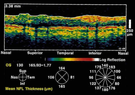GLAUCOMA The diagnosis and management of glaucoma remains a difficult clinical problem. Intraocular pressure measurements do not always adequately predict the extent of glaucomatous change. Optic nerve head and gonioscopic evaluation by slit-lamp biomicroscopy is subjective. Visual field loss and optic nerve head cupping are late clinical findings, detected only after up to 50% of retinal nerve fibers have been lost. OCT, because of its high resolution, is able to detect nerve fiber layer thinning before the onset of visual changes.21 Nerve fiber layer thickness, as measured by OCT, has been shown to correspond to visual function. As expected from the histology of the peripapillary retina, the nerve fiber layer is thickest in the inferior and superior quadrants. The nerve fiber layer has been demonstrated to be significantly thinned in areas corresponding to visual field loss. Typically, the scans are performed radially around the optic nerve for 360° using two radii of curvature (2.25 and 3.37 mm), and the nerve fiber layer thickness is plotted schematically (Fig. 16). Normal nerve fiber layer thickness is a mean of 148.6 microns for superior nerve fibers, 143.5 microns for inferior nerve fibers, 66.9 microns for temporal nerve fibers, and 117.2 for nasal nerve fibers. The direct measurement of the nerve fiber layer thickness by OCT is an objective assessment of glaucomatous progression. OCT shows promise in the early diagnosis of glaucoma before visual field defects, optic nerve head changes, and ophthalmoscopically visible nerve fiber layer loss are evident.