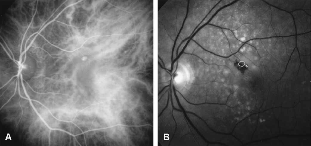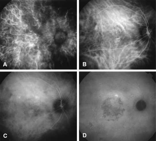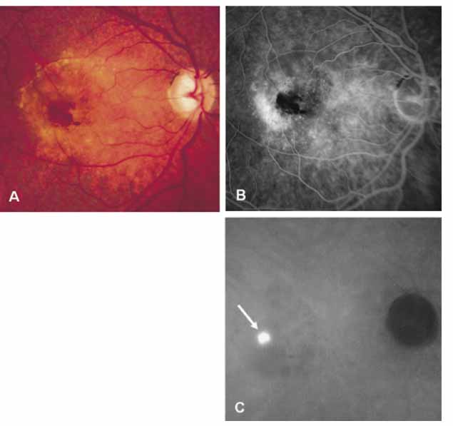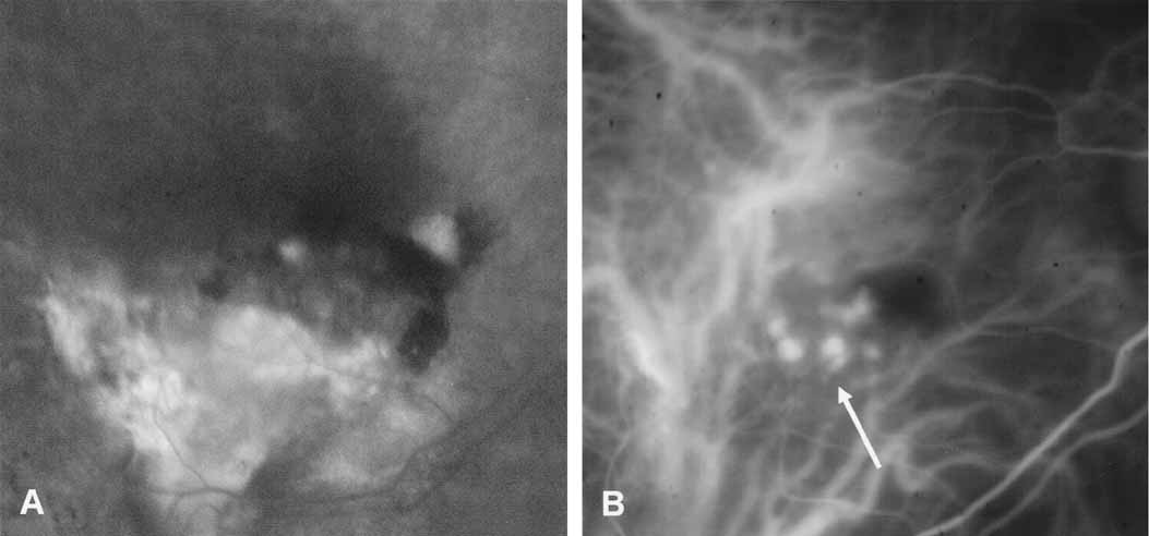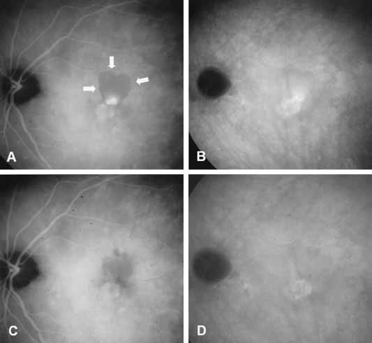 the fluorescence is diminished. Whereas fundus photography and fluorescein angiography do not provide detailed images of the choroidal circulation, the physical characteristics of ICG allow for visualization of the dye through overlying melanin and xanthophyll.24 It has been demonstrated that the retinal pigment epithelium and choroid absorbs 59% to 75% of blue-green light (500 nm) used in fluorescein angiography, but only 21% to 38% of near-infrared light (800 nm) used in ICG angiography. The activity of ICG in the near-infrared light also allows visualization through serosanguineous fluid, shallow hemorrhage, pigment, and lipid exudate, which, even in small amounts, block visualization of sodium fluorescein (Fig. 2). Enhanced imaging of conditions such as choroidal neovascularization (Fig. 3) and pigment epithelium detachment is the result (Fig. 4). |