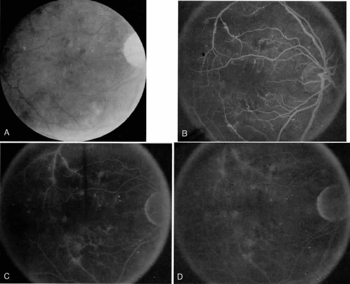 Fluorescein angiography may be helpful in searching for subtle patches of neovascularization or capillary nonperfusion when either significant preproliferative signs are present or proliferative disease is suspected and media opacity precludes a good view. In this last circumstance, fluorescein angioscopy may be more helpful in scanning the retina to detect areas of leakage from neovascularization; however, fluorescein angioscopy is not helpful in the confirmation nor the guidance of treatment for macular edema. Angiography may also be helpful in detecting specific fronds of neovascularization when blood from a vitreous hemorrhage obscures the view; this can guide the ophthalmologist to areas of active neovascularization that may be treated with focal ablation. In general, indications for retreatment include increasing neovascularization, new areas of neovascularization, new vitreous hemorrhage, and failure of the initial neovascularization to regress.1,30,34 Each of these findings should be determined on clinical examination and do not usually need fluorescein angiography for confirmation. However, the progression or regression of neovascularization can be readily followed by serial clinical examinations and on color fundus photography, and can be used as a permanent record for comparison. The significance of capillary nonperfusion in the midperipheral retina has been illustrated in the fluorescein angiographic studies by Shimizu.35,36 Clinically the angiographic demonstration of a significant amount of capillary nonperfusion or dropout may be helpful in those special circumstances where photocoagulation treatment is being considered for severe preproliferative or early proliferative disease. These special circumstances include accelerated retinopathy during pregnancy, imminent cataract surgery or worsening cataract, unreliable or inadequate follow-up, concomitant presence of carotid occlusive disease, and the comparative status of the fellow eye. |
