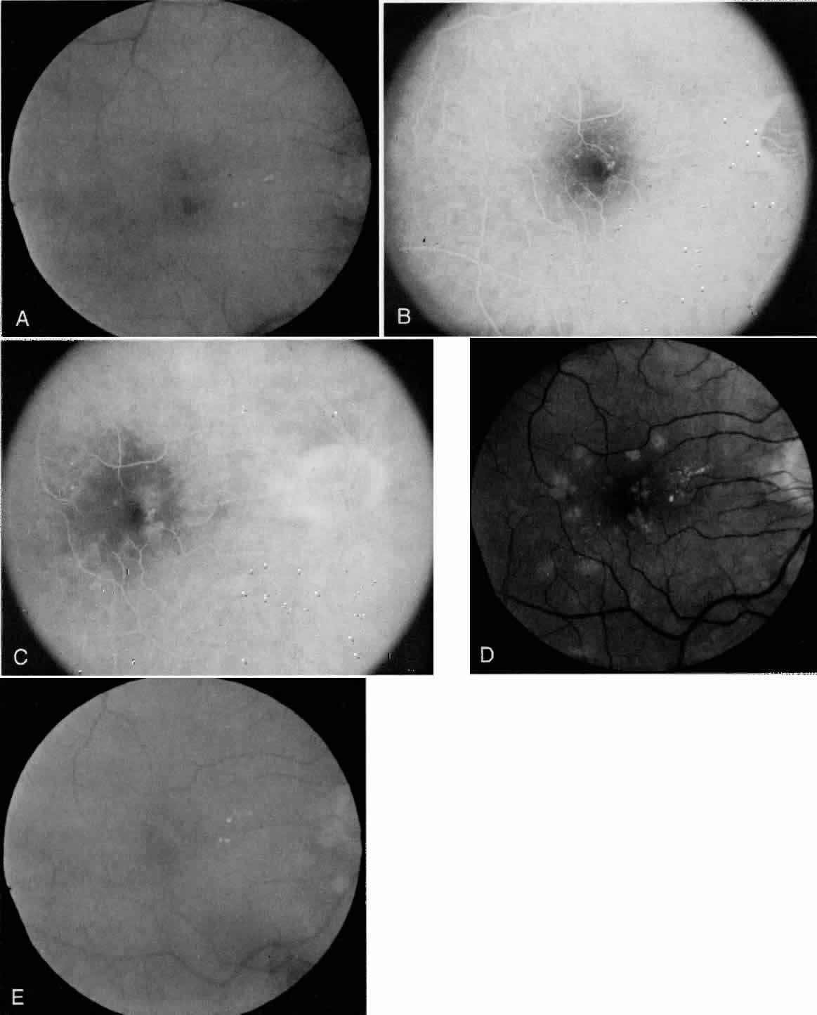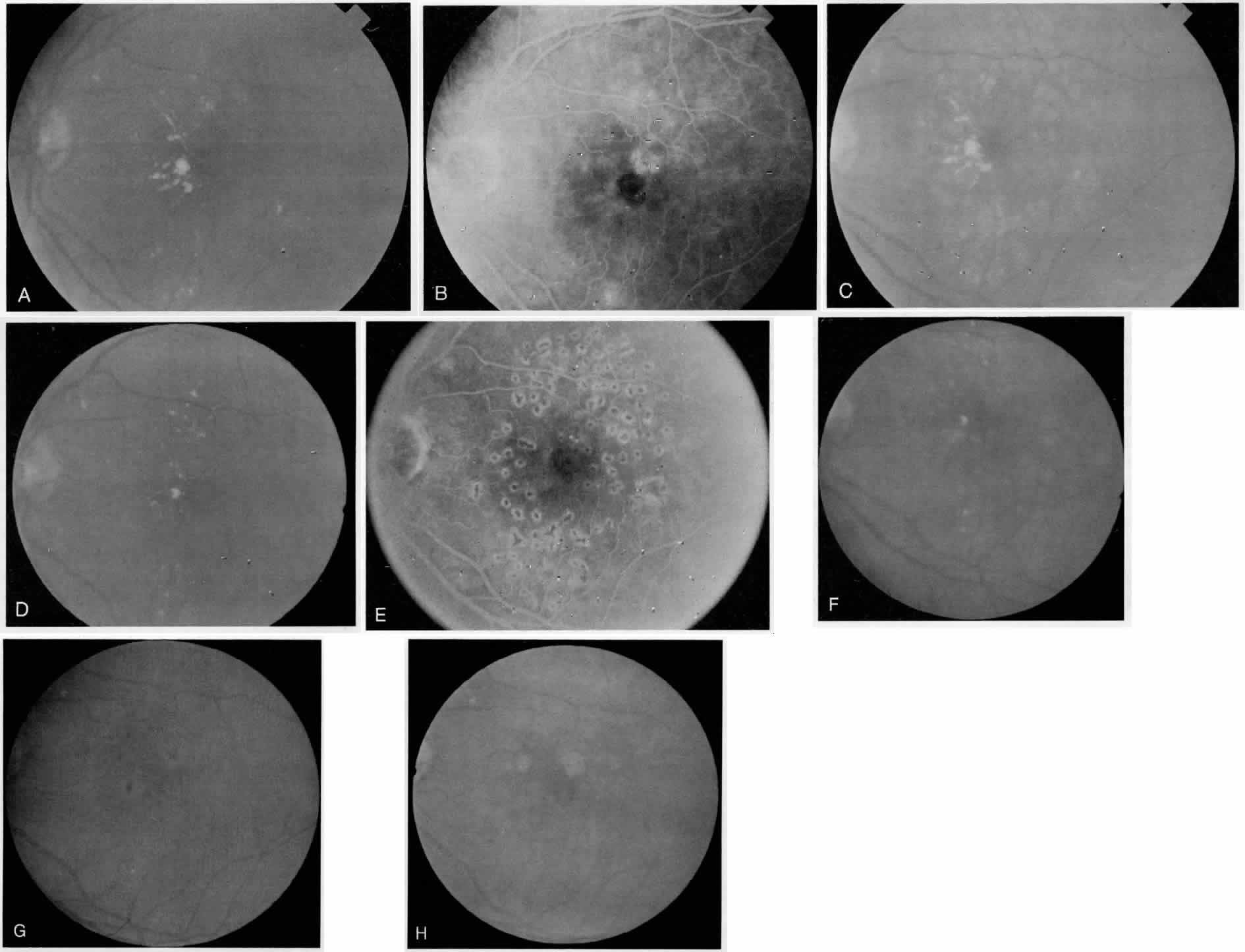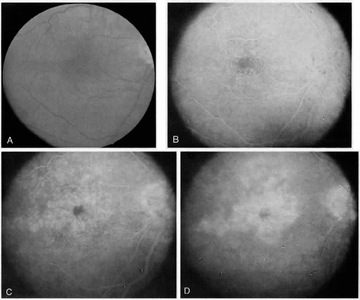 Supplemental macular treatment was required by the ETDRS if macular edema involved or threatened the center of the macula. Supplemental treatment was allowed for any degree of edema, which met one of the definitions for clinical significance.19,22,23 Fluorescein angiography is again useful in guiding the treatment once the clinical need for retreatment has been determined. Supplemental modified grid macular photocoagulation is recommended by Olk if residual central thickening involving the foveal avascular zone is seen on clinical examination.20,21,26 Only if retreatment is being considered does one obtain a fluorescein angiogram to delineate the areas of leakage, to identify the foveal avascular zone, and to guide in the pattern of treatment (Color Plate. 4, Fig. 4). |