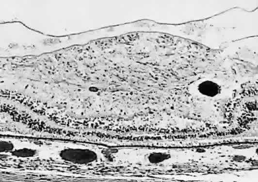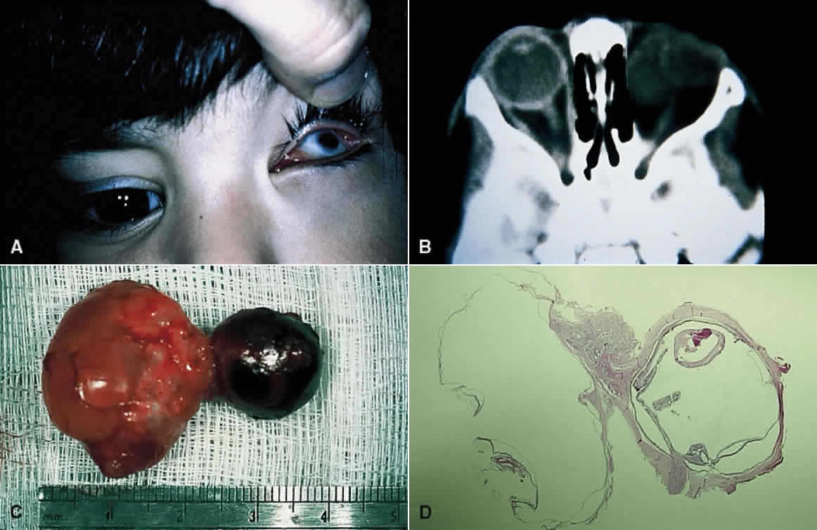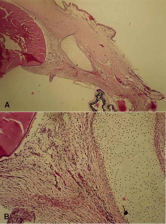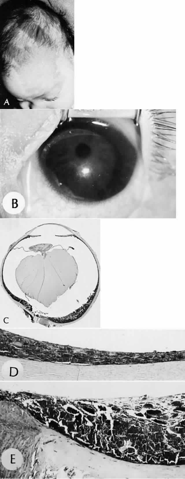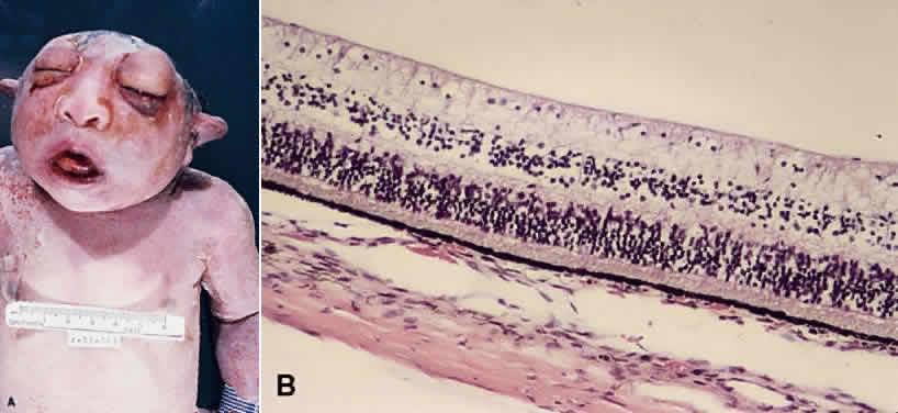 CONGENITAL CYSTIC EYE Another anomaly that occurs very early in embryonic development is congenital cystic eye. This occurs when the optic vesicle fails to invaginate to form the optic cup, as it normally does in the fourth gestational week. Ocular structures that originate from surface ectoderm (the lens, corneal epithelium) and from neural crest (uveal stroma, corneal stroma) are typically not present.14 CYCLOPIA AND SYNOPHTHALMIA In cyclopia and synophthalmia, the telencephalon fails to divide into two hemispheres, and thus midline structures, including the septum pellucidum, corpus callosum, neurohypophysis, and olfactory lobes, do not develop. As would be expected, this extensive malformation is lethal, with a maximum survival of only days.15,16 Because of the failure of telencephalic division, the eyes develop as a completely or partially fused structure in the midline of the face. The other facial anomalies in turn result from the ocular structure's interference with migration. The lids are fused medially to form a diamond-shaped palpebral fissure. The proboscis is located superior to the median ocular structure and has no connection with respiratory apparatus. True cyclopia is the complete fusion of the two eyes in a single midline pseudo-orbit. Synophthalmia, the more common variant, is characterized by partial fusion of the eyes; this is always more marked posteriorly.15–17 The degree of disorganization within the ocular structure is highly variable but tends to be greater medially. Cases that have an associated chromosomal abnormality, such as trisomy 13, tend to be more dysplastic and have more heterotopic elements present, such as cartilage.18 A possible variant of synophthalmos and cyclopia is unilateral diplophthalmos. In this condition, there is a supernumerary, partially fused second eye in the orbit. In a single case presentation, the authors postulated that an anomalous fold had formed in the retina. This fold then came in contact with the surface ectoderm, inducing formation of a second lens and subsequent formation of a fused second eye.19 ANENCEPHALY Anencephaly is a lethal disorder, although it is compatible with completion of pregnancy. It is the most common lethal central nervous system disorder, occurring in 1 to 5 per 1,000 births. The cause is unknown but is postulated to be due to any of several possible teratogens acting at about the third or fourth week of pregnancy.20,21 Folate deficiency is one possible cause; vitamin supplements containing folate reduce the incidence of this condition. The entire cranial vault is missing, with only disorganized neural and vascular tissue present. The orbits are shallow, so the eyes have a characteristic proptosis. The eyes themselves usually are grossly normal. The most common histologic finding is aplasia or hypoplasia of the nerve fiber and ganglion cell layers of the retina and of the optic nerve (Fig. 2).22 Other less-common findings include angle abnormalities, uveal colobomas, retinal dysplasia, epibulbar dermoid, persistent hyaloid artery, and retinal neovascularization.23