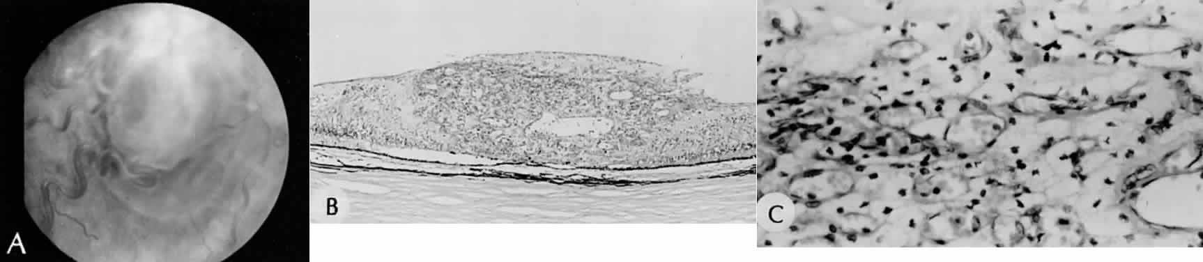 The intracranial malformation may hemorrhage, but retinal hemorrhage is unusual.63 Venous occlusion and neovascular glaucoma have also been reported.64 Bleeding from similar lesions of the gums and nose can also occur, and there can be associated facial hemangiomas.23,65 All these malformations are high-velocity, high-pressure shunts that contain no intervening capillaries.65 As would be expected from a congenital stationary retinal vascular anomaly, there is no leakage on fluorescein angiography in most cases.66 However, rarely there is secondary leakage because of vascular decompensation from the continued high pressure. Vision may be good or poor, depending on the location and extent of the malformation.65 Secondary strabismus and diplopia may be present. Histologically, these lesions consist of large vessels with fibromuscular coats. Typically, no differentiation between artery and vein is possible. The vessels may occupy the entire thickness of the retina and may be adherent to Bruch's membrane. The retina in the area supplied by these vessels may show cystic degeneration.66–68 |