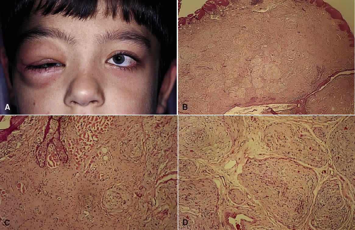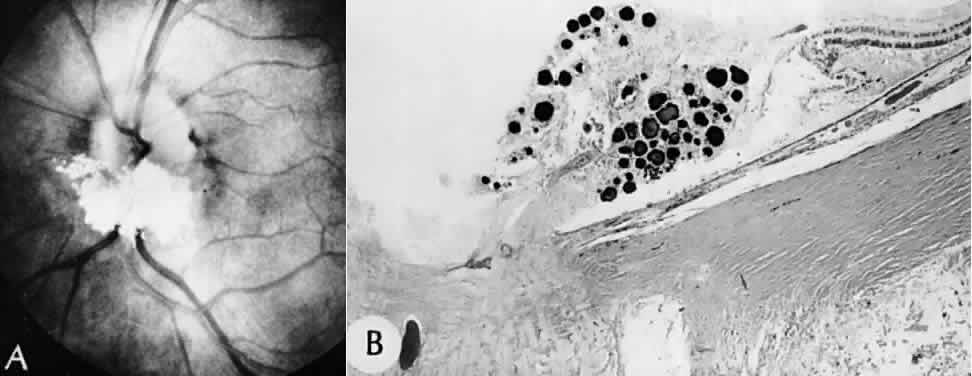 a given phakomatosis.24 ANGIOMATOSIS OF THE RETINA (VON HIPPEL DISEASE) The characteristic retinal lesion in this disease is a capillary hemangioma (hemangioblastoma), composed of blast-like vascular endothelial cells and pericytes, along with foamy cells that contain lipid (Figs. 3 and 4).26,27 The origin of these foamy cells has been controversial.28 Recent work has shown that they are the true neoplastic component of the hemangioblastoma. Von Hippel-Lindau angiomatosis is inherited as an autosomal dominant with incomplete penetrance. The mode of inheritance and the mechanism of disease are similar to those of retinoblastoma—that is, the condition is inherited as an autosomal dominant trait, so that the patient is heterozygous for the abnormal gene. However, at the cellular level, within the tumor, the neoplastic cells undergo a second mutation and are homozygous. These homozygous cells are the tumor cells, and they express vascular endothelial growth factor.29 Large feeder vessels supply and drain the hemangioblastoma, which is typically located inferotemporally near the equator. The small vessels within the tumor leak lipid-rich fluid, which can result in retinal exudates and hemorrhages. By electron microscopy, the tumor vessels have fenestrations, making them permeable to these metabolites.30 Secondary complications include exudative retinal detachment and fibroglial bands. Also, neovascularization of the iris, peripheral anterior synechiae, and secondary angle-closure glaucoma may result. New lesions appear in the retina as small, flat, red nodules with normal afferent and efferent vessels; these patients must be followed and treated when appropriate, because these lesions will develop into typical capillary hemangiomas.31,32 Less commonly, such lesions spontaneously regress.33 The retinal capillary hemangiomas are bilateral in 50% of patients. Lindau described a similar malformation in the cerebellum; such lesions occur in 20% of patients. Other parts of the brain, including the medulla and spinal cord, less commonly have capillary hemangiomas.34 Other systemic visceral findings include cysts of the pancreas and kidney, renal cell carcinoma, and pheochromocytoma.24 MENINGOCUTANEOUS (ENCEPHALOTRIGEMINAL) ANGIOMATOSIS—STURGE-WEBER SYNDROME This syndrome is characterized by hemangioma of the face (nevus flammeus or port-wine stain), frequently in the distribution of the first and second divisions of the fifth cranial nerve; meningeal calcification; and congenital glaucoma, all generally on the same side. This condition is congenital but usually is not hereditary. In some families, it may be inherited as an irregular autosomal dominant trait.23 A choroidal hemangioma is often present on the same side of the face as the nevus flammeus. This hemangioma is characteristically different from hemangiomas not associated with Sturge-Weber syndrome in that it tends to be flatter, more diffuse, and more extensive, and to have indistinct margins. Moreover, these hemangiomas are more likely to consist of a mix of capillary and cavernous vessels than are sporadic hemangiomas. There can be associated retinal leakage, edema, and retinal detachment (Fig. 5).35 The vascular lesions of the face, meninges, brain, and choroid are cavernous hemangiomas. The brain and meningeal lesions may calcify and may be associated with seizures and mental retardation.23 Glaucoma is present in 30% of cases, especially if the ipsilateral lids are involved in the facial hemangioma.36 Often the glaucoma is congenital, with buphthalmos and abnormalities of the chamber angle similar to other congenital glaucomas. The glaucoma may not occur until later in life; at that time it is associated with a more normal-appearing anterior chamber angle. It has been proposed that elevated episcleral venous pressure is involved in the pathogenesis of the glaucoma, and that the draining vessels are part of an intrascleral or episcleral hemangioma.36 In cases of glaucoma of later onset, accelerated aging changes in the angle as seen in trabeculectomy specimens have been noted.37 VON RECKLINGHAUSEN NEUROFIBROMATOSIS In recent years, it has become clear that there are two types of neurofibromatosis, both of which are inherited as autosomal dominant traits. However, they map to different chromosomes and have different characteristic findings. The gene products of the two conditions are both tumor suppressor proteins. Neurofibromatosis 1 (NF1) is the “classic” neurofibromatosis, which occurs in about 1 in 4,000 persons. The genetic mutation occurs on the long arm of chromosome 17,38 and the gene product has been identified.39 Requisite for the diagnosis of neurofibromatosis is the café-au-lait spot; six or more such spots, larger than 1.5 cm in diameter, should be present. They are highly suggestive for neurofibromatosis, although by themselves are not diagnostic. Familial café-au-lait spots do occur but are very rare.39 Histologically, café-au-lait spots show hyperpigmentation of the basal layer of the epidermis. They appear at birth or within the first 2 years of life, although they are smaller in prepubertal individuals. In addition to café-au-lait spots, other diagnostic criteria include Lisch nodules, freckling in the axillae or groin, dysplasia of the sphenoid bone or of long bone cortex, and a first-degree relative with NF1. Lisch nodules of the iris are well-demarcated, pigmented, dome-shaped lesions that are readily visible on the iris surface. However, on a dark iris, they may appear hypopigmented. These nodules are present in more than 90% of older children and adults with neurofibromatosis.40 Histologically, they are composed of melanocytes with long, interwoven processes.41,42 Dysplasia or partial absence of the greater wing of the sphenoid bone can give rise to pulsating exophthalmos.43 This partial absence allows communication between the orbit and cranial cavities, sometimes with an associated encephalocele. Tumors