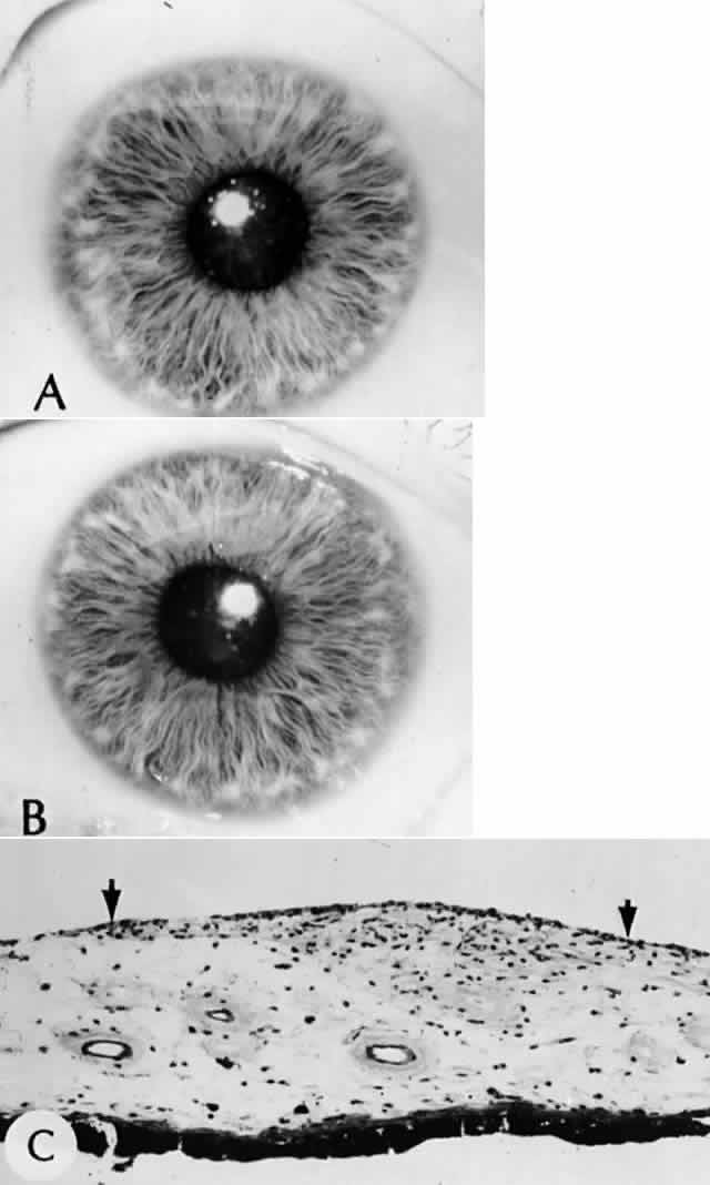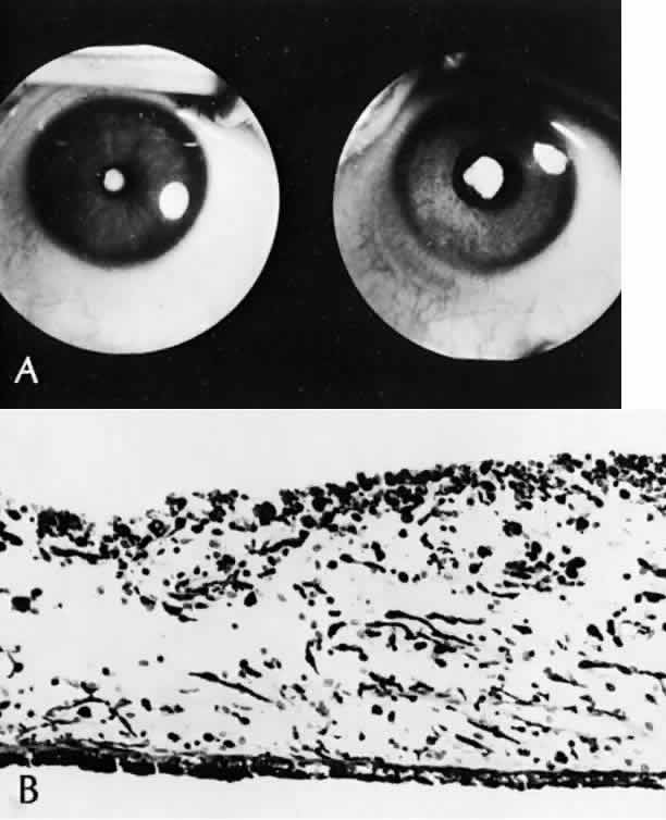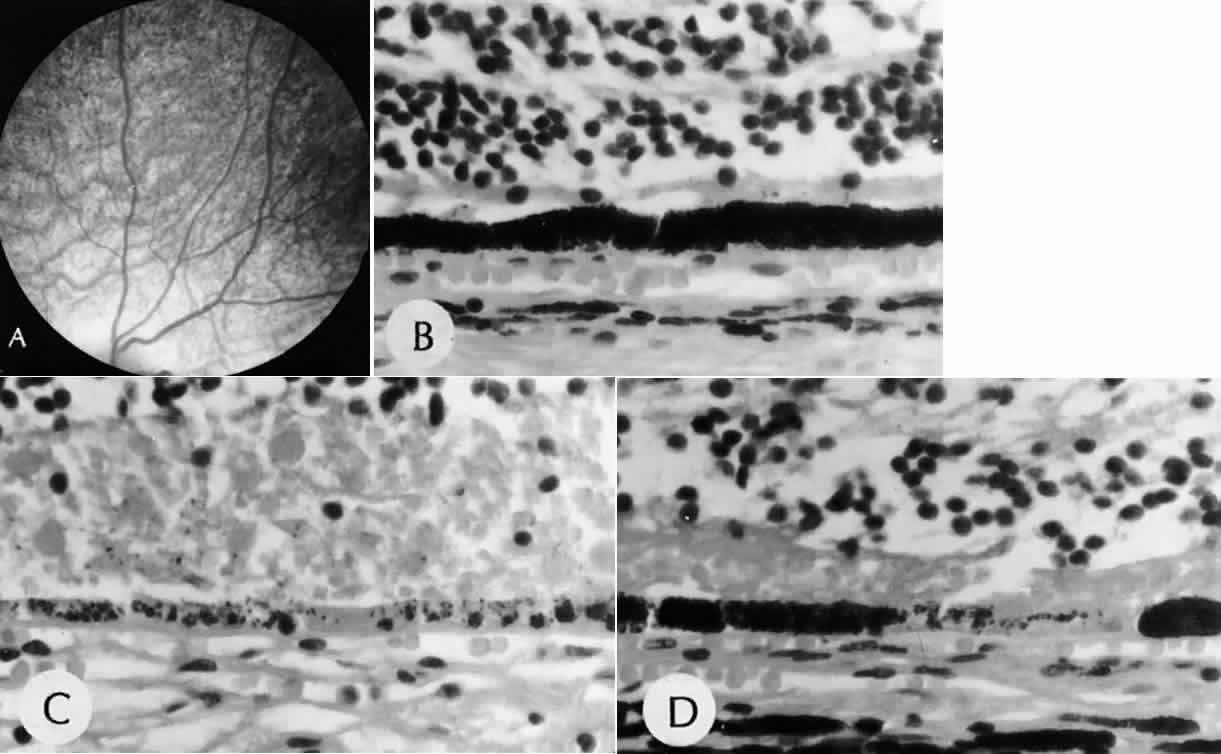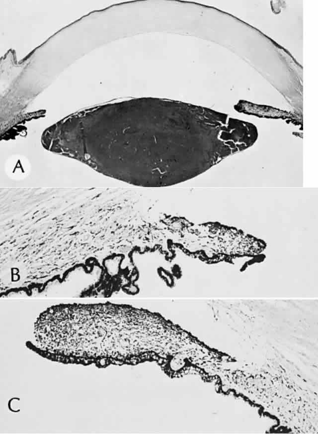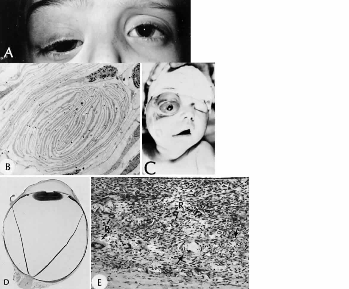 volumes. RUBELLA The rubella virus can pass through the placenta and infect the fetus, thereby causing abnormal development. If this takes place during the first 4 weeks, a time when the woman is often unaware of the pregnancy, there is a 50% likelihood of the fetus being affected. Overall, 20% of fetuses are affected by maternal infection during the first trimester.115 Affected infants frequently have a low birth weight and can have malformations of the central nervous system, heart, and genitourinary system. Some level of deafness is present in 66% of patients.116 Other abnormalities include juvenile diabetes mellitus,117 thrombocytopenic purpura, osteomyelitis, and dental abnormalities. In most series, cataract is the most common ocular finding.116 Histologically, there is persistence of the lens nuclei within the embryonic nucleus, a characteristic but not pathognomonic finding.118 There is also anterior and posterior cortical degeneration. The rubella virus can survive in the lens up to 3 years. Cataract surgery can release the virus into the eye, causing an endophthalmitis, so cataract surgery should probably be done in a single procedure.119 The iris can be leathery and dilates poorly in response to mydriatics. Histologically, the iris has a poorly developed dilator muscle, with necrosis of the iris and ciliary body epithelium and chronic nongranulomatous inflammation of the stroma (Fig. 16).118 This inflammatory reaction sometimes becomes clinically manifest after cataract extraction, which can lead to cyclitic membrane formation and retinal detachment.119 Probably the most characteristic finding is the “salt-and-pepper” fundus, present in up to 60% of cases.116 Histologically, the retinal pigment epithelium is intact throughout but shows focal areas of hyperpigmentation and hypopigmentation (Fig. 17).118,120 Some older patients have developed subfoveal neovascularization.121,122 Glaucoma is also associated with the rubella syndrome, and histologically the angles appear immature, as in other types of congenital glaucoma.118 Glaucoma has also been reported in later childhood and adulthood.123 In a recent clinical series, glaucoma was significantly associated with microphthalmia.116 |