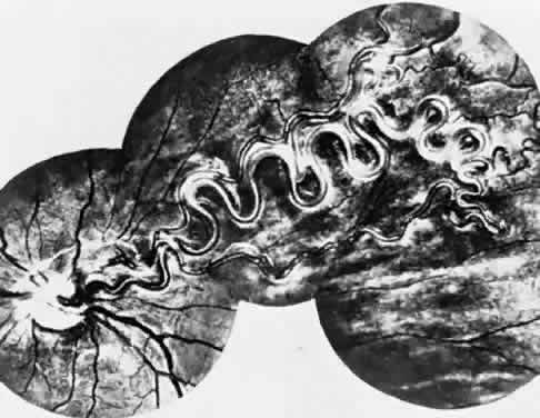 ATAXIA-TELANGIECTASIA (LOUIS-BAR SYNDROME) Ataxia-telangiectasia consists of telangiectasias (hamartias) of the conjunctiva and skin along with a progressive cerebellar ataxia, often with mental retardation. The conjunctival telangiectasias manifest in early childhood and are present in 100% of cases. Nystagmus and other abnormal eye movements also are present in all patients.58 The disease is transmitted as an autosomal recessive trait.59 Recently, the gene was localized to the long arm of chromosome 11.60 There is an associated deficiency of both cellular and humoral immunity, along with degeneration of the thymus. These patients therefore often develop sinus and respiratory tract infections, and these are the usual causes of death. These patients are generally much more sensitive to ionizing radiation and are also more susceptible to cancer, particularly leukemias and lymphomas, than the general population. Carriers, who are heterozygous for the gene, have a sensitivity to cancer and to ionizing radiation intermediate between the general population and homozygous individuals.60 ARTERIOVENOUS COMMUNICATION OF RETINA AND BRAIN (WYBURN-MASON SYNDROME) The Wyburn-Mason syndrome is a rare syndrome that tends to become symptomatic in adolescence or young adulthood. It consists of generally unilateral arteriovenous communications in the retina (Fig. 12) and ipsilateral midbrain.61,62
