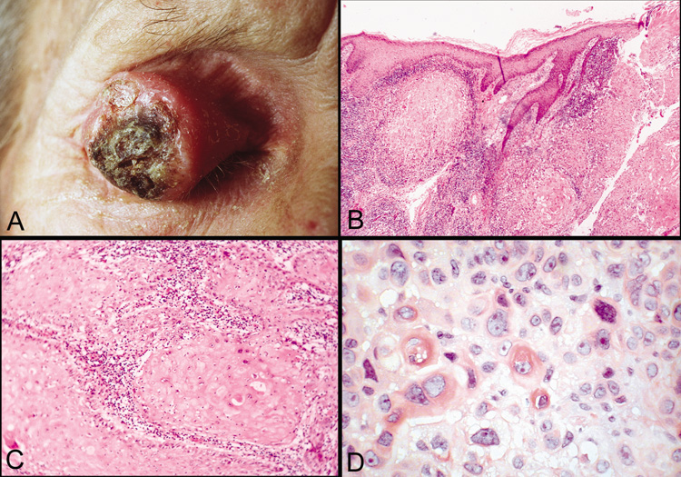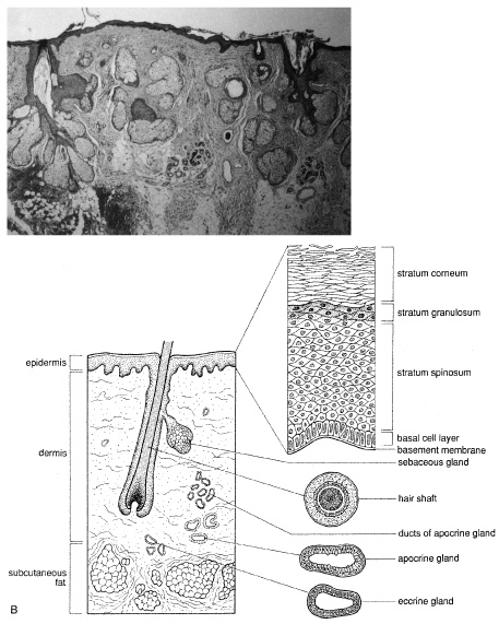 skin cancers, which are most commonly found on the central face. Histologic findings in normal periorbital skin are similar to other areas of the body with a keratinizing epidermis and a prominence of sebaceous glands and blood vessels (Fig. 1, A and B). Lid skin is very thin, its epidermis is composed of only a few layers of keratinocytes (squamous cells), there is an absence of the typical rete ridge (digitated) pattern, and there is a sparse dermis composed of fine fibrillar collagen fibers. Virtually every inflammatory dermatosis and cutaneous neoplasm may, at times, affect the periorbital skin and lids, but some inflammatory processes and neoplasms are commonly seen in this area, and a few are quite specific to the area.