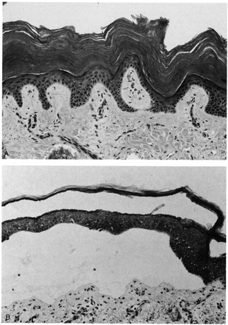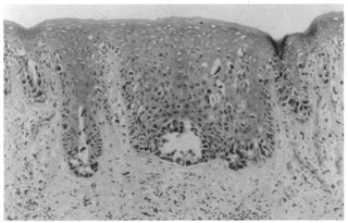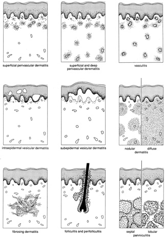 dermatopathology and are seen in a variety of conditions. Hyperkeratosis is increased thickness of the stratum corneum (the most superficial, cornified layer of the epidermis). Orthokeratosis is hyperkeratosis composed of cells with complete keratinization and no remnants of nuclei. Parakeratosis is a manifestation of incomplete keratinization in which nuclei are retained in the cells of the stratum corneum. Generally, a thick granular layer is found beneath orthokeratosis due to slow upward migration of keratinocytes, and a thin or absent granular layer is seen beneath extensive parakeratosis due to increased cell turnover and migration. The changes in the superficial portions of the epidermis are a clue to epidermal pathologic processes. Leukoplakia (white plaque) is strictly a clinical term. Any lesion of a mucous membrane (including conjunctiva) with hyperkeratosis will appear as leukoplakia. Hyperkeratosis may be induced by an underlying lesion, such as a pinguecula, pterygium, papilloma, or carcinoma in situ. Hyperplasia is an increased number of cells in the epidermis, which results in overall architectural changes, including projection above the skin surface, elongation of the rete ridges, and widening of the rete ridges. Acanthosis is defined more specifically as an increased thickness of the stratum spinosum (spinous or middle layer) of the epidermis. Acantholysis is a separation of epidermal cells (keratinocytes) from each other and is caused by a variety of pathologic processes that result in a degeneration of intercellular connections. This separation may lead to histologic clefts, tiny intraepidermal vesicles, or larger intraepidermal bullae. Acantholysis may occur secondary to spongiosis (intercellular edema), ballooning (intracellular edema), or a genetic or immunologic dissolution of anatomic attachments or intercellular ground substance. Spongiosis is a histologic term that describes the fluid accumulation between epidermal cells that eventually leads to cleft or vesicle formation. It is most commonly seen in inflammatory conditions, especially the spectrum of dermatitis. Ballooning or intracellular edema is characteristic of virally infected cells. Eventually, the fluid causes cell rupture and formation of coalescent clefts or spaces. It is important to make a distinction between atypical cells, dyskeratotic cells, and necrotic cells in the epidermis. An atypical cell is one in which the normal nuclear-to-cytoplasmic ratio is altered in favor of the nucleus (nuclear hyperplasia), the nucleus stains darker than normal (hyperchromasia), the nuclear configuration may be abnormal (multinucleated, indented, cerebriform, etc.), or a cell may contain an abnormal mitotic figure. When individual nuclei are sufficiently atypical or large numbers of atypical cells are present, the lesion is usually malignant or cancerous. Atypical cells, however, such as those seen in lymphomatoid papulosis (a benign inflammatory condition) should not be regarded as the only criterion necessary for a diagnosis of malignancy. Architectural histologic features and clinical factors must be taken into consideration. Dyskeratosis refers to increased keratinization of individual epidermal cells. These are characterized by abundant eosinophilic staining cytoplasms and small, normal-appearing nuclei. In contrast, necrotic keratinocytes have nuclear karyolysis and pyknosis with homogeneous pink cytoplasms. Vesicles or bullae are distinguished by size and refer to separations within the epidermis (intraepidermal vesicle or bulla) or beneath the epidermis (subepidermal bulla). Subepidermal bullae may occur within the dermal–epidermal junction zone or beneath this zone. Atrophy refers to a thinning of the epidermis, effacement of the rete ridges, disorder of epidermal architecture, diminution or loss of skin appendages, and alterations of the collagen and elastic fibers in the dermis. These changes are clinically seen as wrinkling and laxity of skin. The study of dermatology and dermatopathology is made difficult by the large number of described conditions and diseases and is often hindered by obscure historic terminology. In 1978, Ackerman published a landmark textbook, Histologic Diagnosis of Inflammatory Skin Diseases, a Method by Pattern Analysis. He successfully presented a scheme to simplify the analysis of inflammatory skin diseases by describing nine basic histologic patterns with many subcategories (Fig. 2). This categorization has allowed skin pathologists to diagnose more precisely many inflammatory conditions and to provide the clinician with a more useful differential diagnosis when a specific diagnosis cannot be rendered.