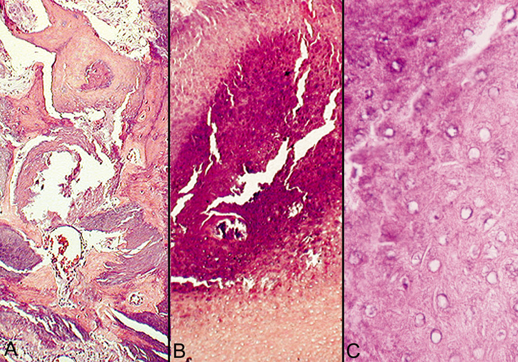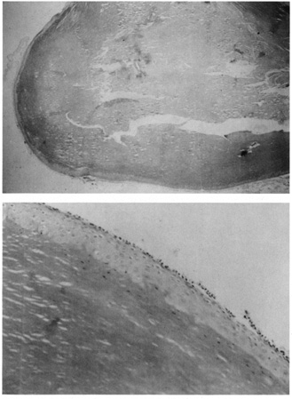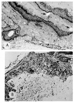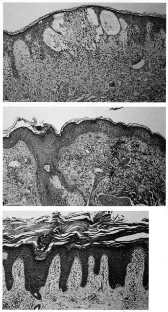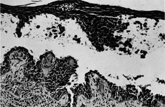 Bullous pemphigoid occurs mainly in older patients and is characterized by large, tense, firm bullae. Histologically, there is a discrete subepidermal separation with a prominence of eosinophils in the inflammatory infiltrate. Almost all patients have circulating IgG antibodies that deposit at the dermoepidermal junction in a linear fashion. Bullous pemphigoid rarely leaves significant scars. Cicatricial pemphigoid is a related subepidermal bullous disorder that mainly affects the mucosal surfaces, is predominantly conjunctival and oral lesions, and characteristically resolves with scarring, which may lead to blindness. Histologically, it is similar to bullous pemphigoid, but, quite often, there are more neutrophils in the infiltrate and more extensive spongiosis in the epidermis. Again, IgG antibodies are directed against protein components of the basement membrane. Erythema multiforme is a common pathway cutaneous reaction to drugs, viral or bacterial infections, or unknown causes. Characteristic “target“ lesions are seen as round-to-oval erythematous plaques with central darkening and marginal erythema. In its most severe form, Stevens-Johnson syndrome, the mucocutaneous surfaces (including the conjunctiva) are predominantly affected in association with a systemic syndrome, which may lead to death. Histologically, erythema multiforme and Stevens-Johnson syndrome are characterized by a dense lymphohistiocytic infiltrate that obscures the dermoepidermal junction associated with progressive necrosis of keratinocytes from the basilar to the uppermost portions of the epidermis. The intraepidermal and subepidermal vesiculation may lead to severe scarring of mucosal surfaces. |