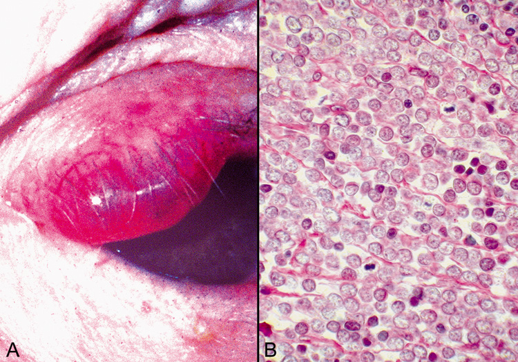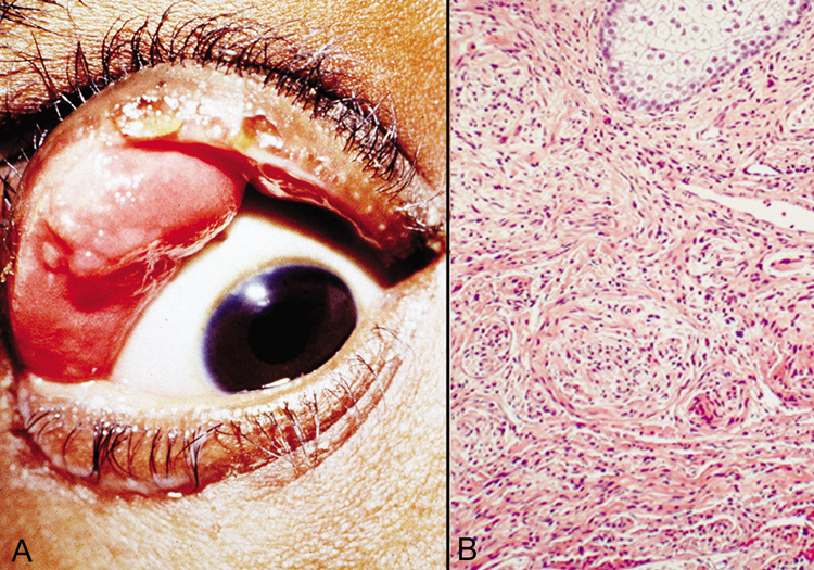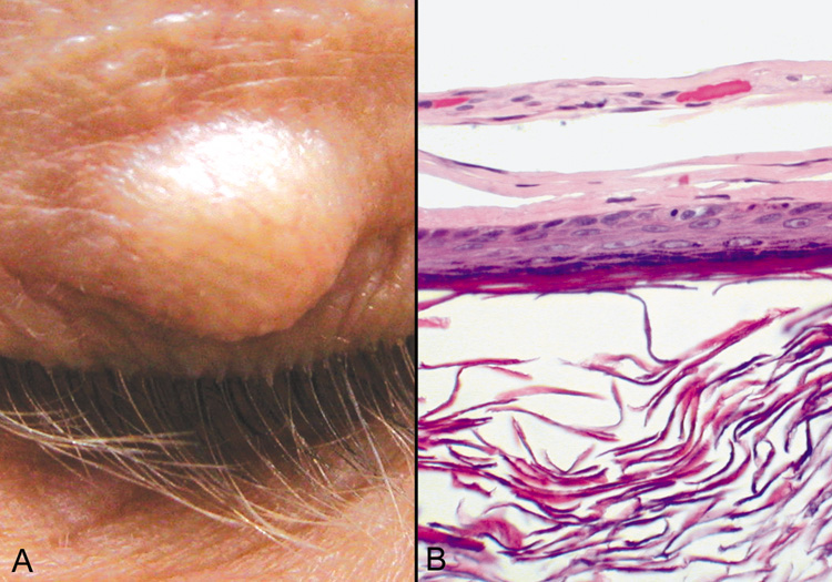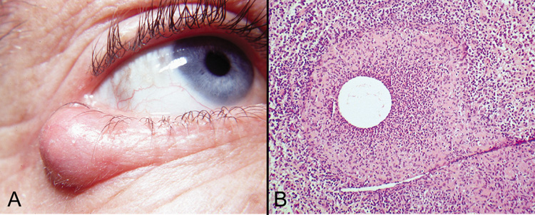 of neutrophils between collagen bundles. The epidermis appears normal. An external hordeolum (stye) (Fig. 4) results from an acute purulent inflammation of the superficial sweat and sebaceous glands or hair follicles of the eyelids, while an internal hordeolum occurs in the meibomian glands within the tarsal plates of the lids. They are characterized histologically by dense inflammation containing neutrophils and foreign body multinucleated giant cells around intact or ruptured appendegeal structures. A chalazion is chronic inflammation of a meibomian gland (deep type) or zeisian sebaceous gland (superficial type) resulting in a clinically firm, painless nodule of the eyelid (Fig. 5A). Histologically, there is deep dermal or subcutaneous suppurative granulomatous inflammation containing neutrophils, plasma cells, lymphocytes, histiocytes, and giant cells in a zonal configuration around central lipid material (see Fig. 5B).