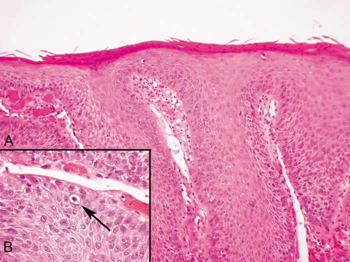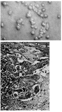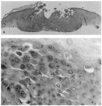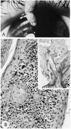 Umbilicated vesicles on an erythematous base progressing to pustules and crusted papules are characteristic of generalized vaccinia (small pox), with new cases recently reported secondary to the small pox vaccine. These vesicles are also characteristic of varicella (chickenpox), herpes zoster (shingles), and primary and recurrent herpes simplex infections (Fig. 6A). Herpesviruses are DNA-containing viruses that infect host cell nuclei resulting in similar, characteristic histologic changes. There is marked intraepidermal vesiculation and necrosis with massive ballooning and rupture of keratinocytes, spongiosis, acantholysis, and a dense superficial dermal perivascular lymphohistiocytic infiltrate with neutrophils, which also are seen commonly infiltrating the epidermis. Multinucleated epithelial giant cells with nuclei, which are steel gray and demonstrate peripheral margination of clumped chromatin material, are characteristic of early and well-developed vesicles (see Fig. 6B). Progression to near total epidermal necrosis makes these characteristic cells more difficult to identify. Occasionally, eosinophilic staining and small intranuclear inclusions may be visible. A Tzanck smear may be obtained by unroofing a vesicle, scraping the base, and staining the base with Giemsa stain. This rapid diagnostic method enables identification of multinucleated epithelial giant cells and single keratinocytes with characteristic nuclear changes. Lesions of molluscum contagiosum often affect the periorbital and lid skin as 1- to 3-mm domeshaped papules with a small central dell. This large pox virus multiplies in the cytoplasm, and, histologically, homogeneous purple intracytoplasmic inclusion bodies (molluscum bodies) are seen in an acanthotic epidermis (see Fig. 7). Verruca vulgaris (warts) are caused by a variety of papilloma viruses and may present as small papules with a digitated surface or elongated filiform warts around the eyes. Histologically, they demonstrate varying degrees of massive papillomatosis, hyperkeratosis, and acanthosis with parakeratosis and collections of serum in the stratum corneum at the tips of the digitations (Fig. 8). In early warts, the keratinocytes in the granular layer and just beneath the granular layer are vacuolated with condensation and clumping of dark-staining keratohyaline granules and occasional eosinophilic inclusion bodies in the nuclei. |