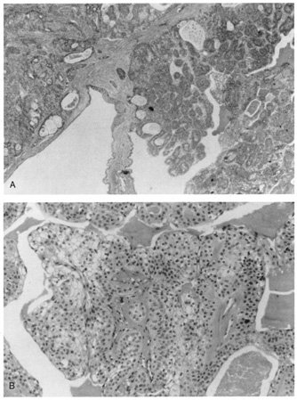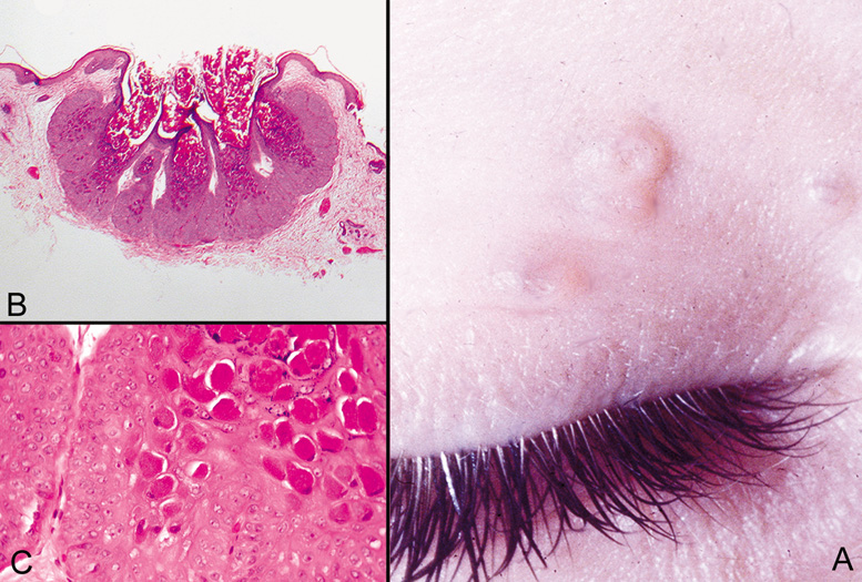 Congenital abnormalities are most often diagnosed on clinical morphologic findings; histologic changes are rarely definitive. Phakomatous choristoma is a congenital tumor of the lenticular anlage, which usually involves the inner aspect of the lower lid. Histologically, cells resembling lens epithelial cells and lens “bladder“ cells, along with patches of a thick, irregular, PAS-positive basement membrane that closely simulates the lens capsule, grow irregularly within a dense fibrous tissue matrix (Fig. 15). The ichthyoses are a group of inherited disorders of keratinization characterized by dryness and excessive scaling of the skin. Ichthyosis vulgaris (autosomal dominant) often demonstrates fine scaling of the lids, lashes, and surrounding skin; X-linked ichthyosis, additionally, may show large, darker, polygonal scales. One of the two rare autosomal recessive types, lamellar ichthyosis, demonstrates large, thick scales often with ectropion of the lids and conjunctival changes. In ichthyosis vulgaris, there is compact orthokeratosis overlying a markedly diminished or absent granular layer without significant inflammation in the dermis (Fig. 16). X-linked and autosomal recessive ichthyoses also show compact orthokeratosis, but the changes in the granular layer are not distinctive. In autosomal dominantly inherited epidermolytic hyperkeratosis, a distinct histologic change is characterized by intracellular edema, vacuolization of keratinocytes, and the appearance of large, clumped keratohyalin granules, especially in the superficial portions of the epidermis. Epidermolysis bullosa is a group of related inherited conditions characterized by skin fragility and blistering in a variety of distributions. Histologically, the subcategories are characterized by varied levels of separation in the skin. Scarring subepidermal bullae, which lead to scars, may occur around the eyes in one of the most severe forms, autosomal recessive dystrophic epidermolysis bullosa. |