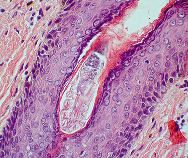 spores. Pityrosporum orbiculare, in its yeast phase, is part of the normal flora of the central face, and small spores (3 μm) are often visible in the stratum corneum, especially in the superficial portions of hair follicles. Tinea versicolor is a more specific disease and presents as hyperpigmented or hypo-pigmented, scaling patches on the face. Scrapings examined in potassium hydroxide (KOH) solution or a biopsy stained with PAS will demonstrate small hyphae and spores in clusters in the stratum corneum (often termed spaghetti and meatballs). The parasitic mite Demodex folliculorum lives in hair follicles with large sebaceous glands, especially around the nose and eyes. Histologically, the mite frequently is seen as an incidental finding in a facial hair follicle with a minimal surrounding inflammatory infiltrate (Fig. 9). Many dermatologists believe that some cases of acne rosacea and folliculitis are caused by large numbers of Demodex, especially in immunosuppressed patients. In these instances, there is dense follicular and perifollicular inflammation.