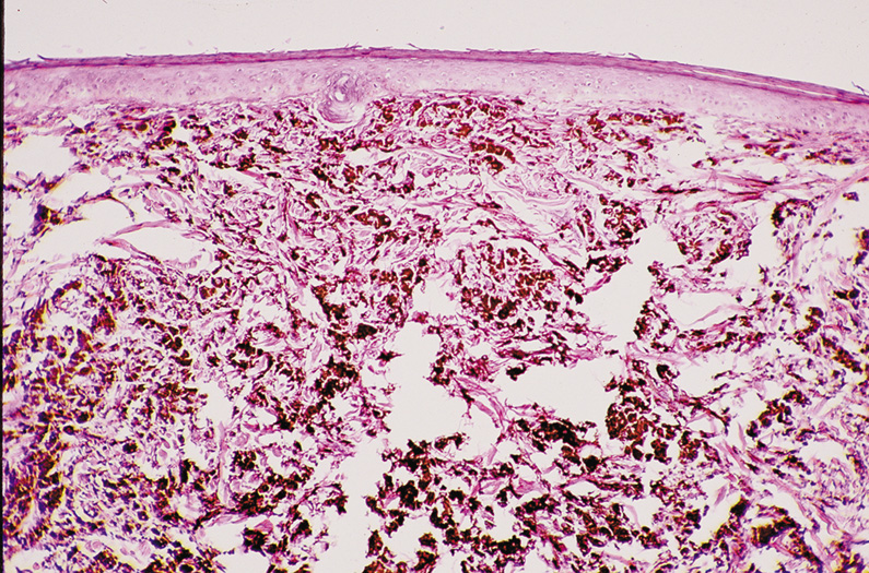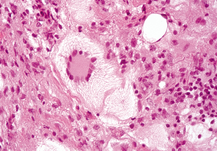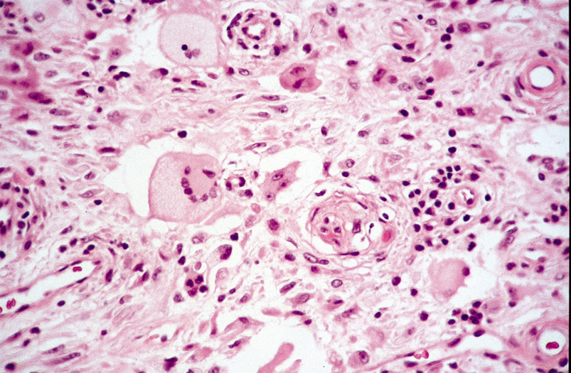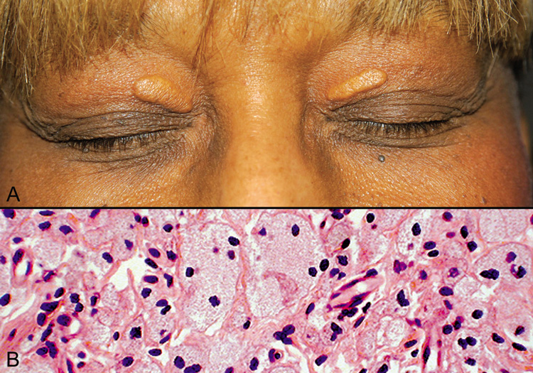 can be seen between collagen bundles in any of the collagen vascular diseases. A common cutaneous manifestation of dermatomyositis is a violaceous heliotrope around the eyes, on the lids, and on the cheeks. Histologically, there is orthokeratosis, thinning of the epidermis, loss of the rete ridge pattern, and vacuolar alteration at the dermoepidermal junction with a mild lymphohistiocytic infiltrate in the dermis. Scleroderma may occur in a generalized systemic form and several localized cutaneous forms. The characteristic clinical lesion is a sclerotic plaque with an ivory center, which appears bound down when palpated. Histologically, the epidermis is atrophic and there is thickening of the entire reticular dermis extending into the subcutaneous fat with an associated loss of adnexal structures. Individual collagen bundles are broad, eosinophilic, and oriented horizontally. In the early stages, there may be an inflammatory infiltrate at the dermoepidermal junction, but, in later lesions, only sclerosis and a lack of adnexal structures are seen. A wide variety of systemic metabolic disorders may lead to deposition of material in the skin, often around the eyes or on the lids. Small, yellowish, dome-shaped papules are seen in primary systemic amyloidosis or cutaneous amyloidosis. Histologically, small homogeneous globules may be detected in the dermis, especially around blood vessels. Lipoid proteinosis often demonstrates a characteristic string of small dermal papules with a yellowish hue along the lid margins. Again, glycoprotein material is seen as homogeneous bundles or fibers around blood vessels in the superficial dermis (Fig. 11). Xanthelasma commonly occurs in older individuals with normal serum cholesterol. However, in younger patients, it should alert the physician to look for hypercholesterolemia. Soft, yellowish papules and plaques are most prominent on the lower lids and cheek but may be seen on the upper lids. Histologically, dense clusters of foam cells are found in the superficial dermis. Intracellular lipid gives a vacuolated appearance (Fig. 12). Xanthogranulomas are often a manifestation of an underlying systemic condition. Erdheim-Chester disease presents with xanthelasma, and xanthogranulomas (Fig. 13). Juvenile xanthogranuloma may be single or multiple, orange-hued, firm papulonodules on the face. They may be present at birth, but most often arise in infancy. There is a dense diffuse dermal inflammatory infiltrate characterized by large Touton multinucleated giant cells with an amphophilic center surrounded by a ring of nuclei surrounded by an external ring of foamy cytoplasm. Most lesions involute spontaneously. Xanthogranulomas may appear on the iris and produce hemorrhage and glaucoma. Histologically, early lesions show a dense collection of histiocytes, some of which have pale, vacuolated cytoplasm. There also is an inflammatory infiltrate of lymphocytes and eosinophils. Mature lesions show the characteristic foam cells and Touton giant cells. Touton giant cells have a central wreath of nuclei surrounded by foamy cytoplasm (Fig. 14). In late lesions, the infiltrate is replaced by fibrosis. Cutaneous histiocytic proliferations (Langerhans cell granulomatoses) represent a spectrum ranging from Letterer-Siwe disease to eosinophilic granuloma. There may be dense, diffuse nodular infiltrates in Letterer-Siwe disease, with atypical histiocytes demonstrating large, hyperchromatic, kidney bean-shaped nuclei, some of which may infiltrate the epidermis. |