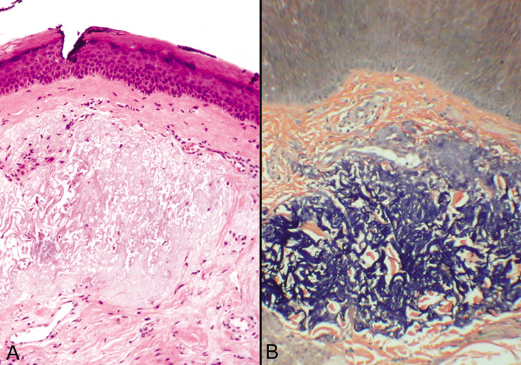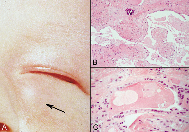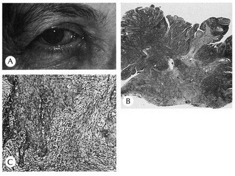 most common skin disease of periorbital and lid skin. Clinical and histologic changes may be divided into acute, subacute, and chronic dermatitis, although lesions may appear or persist in any of the stages. The earliest clinical changes of acute dermatitis are erythema and edema, which may progress to vesiculation, oozing, and then crusting and scaling. There are often secondary changes due to scratching or infection. Chronic dermatitis is characterized by papules and plaques with indistinct borders, less intense erythema, increased skin markings (lichenification) with fine scale and firmness, or induration to palpation. Subacute dermatitis is vaguely intermediate between acute and chronic, with erythematous scaling papules, rare small vesicles, and slight clinical induration. An end-stage of chronic dermatitis often is referred to as lichen simplex chronicus, most commonly seen in atopic dermatitis. A thorough clinical history and examination with emphasis on the distribution and characteristics of lesions often allow a more specific typing of dermatitis with a relationship to cause. The most common form of dermatitis around the eyes is irritant contact dermatitis, which is a nonimmunologically mediated reaction of the skin caused by exposure to an irritating substance. All individuals will react if the concentration of an irritant substance is sufficiently high or the duration of contact is long enough. Mild irritant dermatitis is usually caused by soaps and detergents; more acute and severe dermatitis may be related to more toxic acids, alkalies, and solvents. Allergic contact dermatitis is a type IV immunologic reaction requiring a primary exposure, sensitization, and re-exposure to an allergen with an immunologic delay before clinical expression of the dermatitis. A detailed history and subsequent patch testing may be necessary to identify a specific allergen. Atopic dermatitis is a chronic, severely pruritic dermatitis associated with a personal or family history of atopy (asthma, allergic rhinitis, atopic dermatitis). It is characterized by a typical morphology and distribution, a chronic relapse in course, and a variety of associated findings. Periorbital and lid skin involvement is common. Seborrheic dermatitis, dyshidrotic dermatitis of the hands and feet, stasis dermatitis of the lower extremities, and nonspecific neurodermatitis are other variants. Photodermatitis may be either irritant or allergic in etiology and requires a history of an association between the appearance of the dermatitis and sun exposure. Blepharitis is simple, diffuse inflammation of the lids. Sebhorrheic blepharitis is a specific type of chronic blepharitis primarily involving the lid margins and is often associated with dandruff and greasy scaling of the scalp, eyebrows, central face, chest, and pubic areas. Hyperemic, inflamed lid margins and yellow, greasy scales on the lashes are characteristic identifiers. All types of dermatitis are characterized histologically by spongiosis (accumulation of fluid between the keratinocytes of the epidermis) and a mild, superficial perivascular, predominantly lymphohistiocytic, mononuclear cell infiltrate in the superficial dermis. Confluent spongiosis leads to intraepidermal vesiculation in acute dermatitis (Fig. 3A), and milder or focal spongiosis without vesiculation is seen in subacute variants (see Fig. 3B). Chronic dermatitis is characterized by compact orthokeratosis (usually secondary to the patient rubbing), irregular epidermal hyperplasia, and scant to absent spongiosis. In the superficial dermis (papillary dermis), the collagen bundles are abnormally thickened and are oriented perpendicular to the plane of the epidermis (see Fig. 3C). Urticaria is the widespread appearance of pruritic hives or erythematous, slightly indurated, nonscaling dermal papules or plaques. These may occur at any body site and usually are transient, with individual lesions lasting less than 24 hours; new lesions, however, appear continuously or in bouts. When periorbital or lid skin is involved, there are coalescent erythematous papules without surface scale or change. Biopsy shows a normal epidermis with edema of the superficial dermis and a scant perivascular lymphohistiocytic infiltrate, occasionally with a few eosinophils in urticaria of short duration or a few neutrophils in more chronic conditions. Angioedema presents with deeper, more indurated swelling characterized by deep dermal and subcutaneous edema on biopsy. Urticaria and angioedema are often associated clinically and may be due to a multitude of etiologies. There is also a specific type of hereditary angioedema secondary to a low serum level of the inhibitor of the first component of complement. |