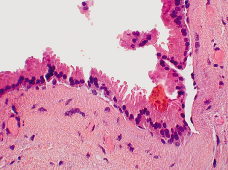 CYSTS Epidermal Inclusion Cysts and Milia Epidermal inclusion cysts are follicular cysts of the hair follicle infundibulum, which most often occur on the outer upper portion of the eyelid as firm, round, slow growing lesions. Cystic dilatation of the follicle occurs from occlusion of the orifice, which may be precipitated by trauma. Milia are identical to epidermal cysts but are smaller. Multiple epidermal cysts, especially of the face and scalp, may occur in Gardner's syndrome. Histologically, epidermal cysts have a wall composed of epidermis with a granular cell layer that is essentially identical to the surface epidermis. Within the cyst there is loose, laminated keratin, much of which may be lost during processing (Fig. 18). Occasionally, the cyst will rupture and produce a foreign body reaction with multinucleated giant cells in the adjacent tissue. Hidrocystomas Cysts resulting from occlusion of the eccrine or apocrine duct are referred to as hidrocystomas. Apocrine hidrocystomas are usually solitary and translucent and are often found near the eye. Eccrine hidrocystomas may be solitary or multiple and are indistinguishable from apocrine hidrocystomas clinically. Histologically, apocrine hidrocystomas are irregularly shaped cysts and are lined by a double layer of epithelium: the outer layer is myoepithelium, and the luminal layer demonstrates decapitation secretion (Fig. 19). Eccrine hidrocystomas are more rounded and show a flattened wall with one or two layers of cuboidal cells (Fig. 20). Pilar (Trichilemmal) Cysts Pilar, or trichilemmal, cysts were previously referred to as sebaceous cysts. They are less common than epidermal cysts and may arise from hair follicles on the lid surface or the brow. These often occur in an autosomal dominant pattern of inheritance. In contrast to epidermal cysts, these cysts are easily enucleated and appear as firm, smooth, white cysts. The name, trichilemmal cyst, came about because these cysts are derived from the isthmus portion of the hair follicle from which keratinization analogous to the outer root sheath of the hair, or trichilemma, occurs. Histologically, pilar cysts possess an epithelial wall without clearly visible intercellular bridges. There is palisading of the peripheral cell layer, and the cells closest to the cyst cavity appear swollen and have a pale cytoplasm (Fig. 21). Within the cyst cavity, there is homogeneous compact eosinophilic material which also may show focal calcification. Cyst rupture is accompanied by a foreign-body granulomatous response.