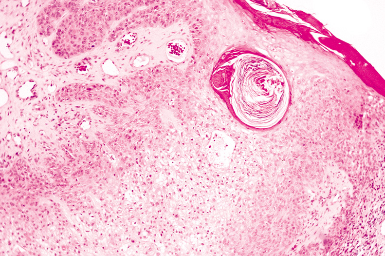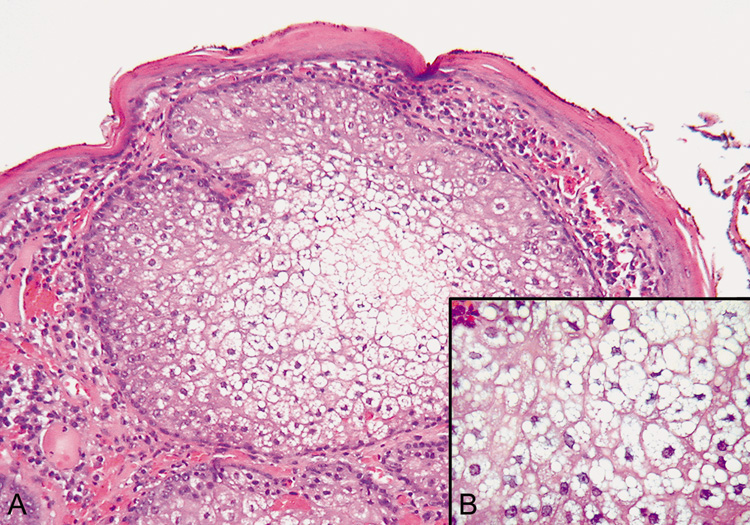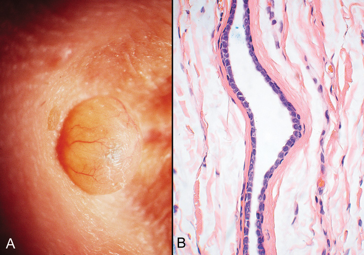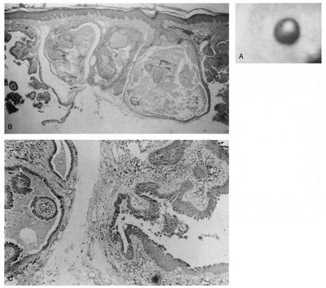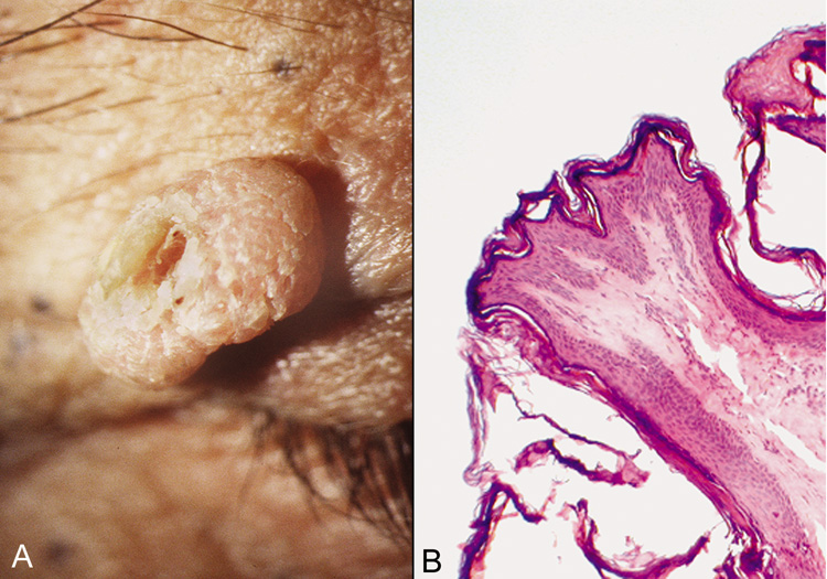 Dermoid Cysts Dermoid cysts are usually present at birth and commonly occur around the eyes. They may be adherent to the periosteum. Dermoid cysts are believed to result from sequestration of skin and its appendages along embryonic lines of closure and, thus, are commonly found at the frontozygomatic suture. Histologically, dermoid cysts are lined by epidermis possessing various mature appendageal structures (Fig. 22). These include hair follicles with terminal hairs, sebaceous glands, eccrine glands, and, occasionally, apocrine glands. Steatocystoma Steatocystoma may occur as solitary cysts (simplex) or multiple cysts (multiplex). The latter is often inherited as an autosomal dominant trait. These cysts are small and firm and, when punctured, exude an oily or creamy fluid. Steatocystoma is derived from cystic dilatation of the sebaceous duct, which empties into the hair follicle. Histologically, the cyst wall is folded and shows several layers of epithelial cells with a palisading of the peripheral cell layer. The cells lining the cystic cavity are covered by a thick, eosinophilic cuticle. Characteristically, flattened sebaceous lobules are present either within or close to the cyst wall. Pilomatrixoma Pilomatrixoma, also referred to as Malherbe's calcifying epithelioma, is a cyst derived from the hair matrix that forms the hair. It is often a solitary lesion and most commonly occurs on the face. Most pilomatrixomas occur in the first two decades of life and, if superficially located, produce a blue-red skin discoloration. Excision is curative. Histologically, pilomatrixomas show two types of cells in variable proportions: a basophilic cell with a dark basophilic nucleus and scanty cytoplasm and a “shadow cell,“ which has an unstained central nucleus and faintly eosinophilic cytoplasm (Fig. 23). There may be an abrupt or gradual transition between the two cells, and few or no basophilic cells may be seen in “old“ lesions. Calcification of pilomatrixoma is frequent and may occur within the shadow cells or in the stroma. The stroma usually is fibrotic and contains a foreign body reaction. Ossification also can occur occasionally. “Hybrid“ Cysts Follicular cysts with differentiation toward two or more of the previously mentioned cysts are referred to as hybrid cysts. Although originally described as a cyst of infundibular and trichilemmal keratinization, hybrid cysts may show any permutation of follicular keratinization. BENIGN TUMORS Epithelial Derivation FIBROEPITHELIAL PAPILLOMA (ACROCHORDON) The fibroepithelial papilloma, also known as a squamous papilloma, acrochordon or skin tag, is a polyp of skin that occurs commonly on or around the eyelids. Histologically, fingerlike projections of papillary dermis are covered by epidermis, which is of normal thickness and shows elongation of the rete ridges and hyperkeratosis. Dilated capillaries are seen in the dermis with a variable chronic inflammatory infiltrate (Fig. 24). If traumatized, there may be necrosis of the epidermis and dermis with ulceration and crust. SEBORRHEIC KERATOSIS. Seborrheic keratoses are the most common benign skin lesions in the geriatric population. They typically increase in size and number with age. Clinically, the lesions are well-demarcated, tan-to-brown papules or plaques with a rough, almost warty, “stuck on“ appearance. Due to their pigmentation, distinguishing the lesions from malignant melanoma is sometimes difficult. In some cases, seborrheic keratoses may be polypoid, resembling papillomas, or shiny and glistening, resembling basal cell carcinomas. Although clinically confused with both melanoma and basal cell carcinoma, they are not thought to be a precursor to malignancy. Histologically, seborrheic keratoses are composed of a proliferation of basaloid cells resembling the basal cell layer of the epidermis (Fig. 25). Six subtypes are recognized: acanthotic, hyperkeratotic, reticulated, clonal, irritated, and melanoacanthoma. All types show acanthosis, hyperkeratosis, and papillomatosis. Because the acanthosis produces an upward extension, the lower border of seborrheic keratoses is even, and a straight line can be drawn from one end of the tumor to the other. A characteristic feature of seborrheic keratoses are the horn pseudocysts, which are horny invaginations cut on cross section. Dermatosis papulosa nigra is a small, pigmented, polypoid seborrheic keratosis seen around the eyes and on the cheeks of Black people. The sudden appearance of numerous seborrheic keratoses, called the Leser-Trélat sign, may herald an internal malignancy. EPIDERMAL NEVUS. Epidermal nevi (nevus verrucosus) are linear verrucous plaques usually present at birth. The lesions may be localized or, rarely, generalized. The latter type may be associated with skeletal or central nervous system abnormalities (epidermal nevus syndrome). There are two major classifications of epidermal nevi: nonorganoid (keratinocytic) and organoid (sebaceous, follicular, and sweat gland). The type of epidermal nevus is determined by its predominant components, keratinocytes, or epidermal appendages. Histologically, there is considerable hyperkeratosis, papillomatosis, and acanthosis with fusion of the rete ridges. Epidermolytic hyperkeratosis may be seen in the localized or, more frequently, the generalized type. INVERTED FOLLICULAR KERATOSIS. Inverted follicular keratosis is a benign epithelial lesion occurring exclusively on hair-bearing surfaces and, most frequently, the face. Middle-aged or older individuals are usually affected. Clinically, the lesion presents as an asymptomatic, pink or flesh-colored papule or plaque. Rapidly growing lesions may be confused with keratoacanthomas. Histologically, inverted follicular keratoses are exoendophytic and symmetric. There is a bulbous proliferation of keratinocytes showing abundant eosinophilic cytoplasms into the dermis. Often, the stratum corneum is parakeratotic and contains neutrophils