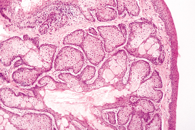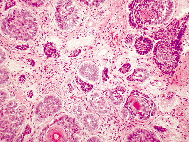Sebaceous Hyperplasia. Sebaceous hyperplasia occurs on the face of middle-aged people. Lesions are often multiple and appear as small, yellowish, slightly umbilicated papules with telangiectasia. Clinically, these can be confused with basal cell carcinoma or sebaceous cell carcinoma. Histologically, multiple mature sebaceous lobules are oriented around a central sebaceous duct (Fig. 31). Sebaceous Adenoma. Sebaceous adenoma is a rare tumor appearing as a circumscribed yellow nodule. The appearance of a solitary sebaceous adenoma may herald an underlying gastrointestinal malignancy (Muir-Torre syndrome). Histologically, lobules vary in size and shape and are composed of an approximately equal ratio of mature and immature sebocytes (Fig. 32). FOLLICULAR TUMORS Trichoepithelioma Trichoepitheliomas may be solitary or multiple and occur most commonly on the face. Multiple lesions are inherited in an autosomal-dominant fashion. Clinically, the lesions are glistening, flesh-colored papules or nodules. They can be confused with basal-cell carcinoma. Trichoepitheliomas and cylindromas have coexisted in the same patient. Histologically, numerous horn cysts surrounded by layers of flattened squamous epithelium are the featured characteristics. There are also islands of basaloid cells in variable numbers (Fig. 33). Often, a foreign-body, giant-cell reaction in the stroma occurs due to the rupture of horn cysts. Desmoplastic trichoepithelioma, a variant of trichoepithelioma, appears as an indurated plaque with a raised annular border. Histologically, the lesion contains narrow strands of tumor cells in a densely collagenous and acellular stroma.