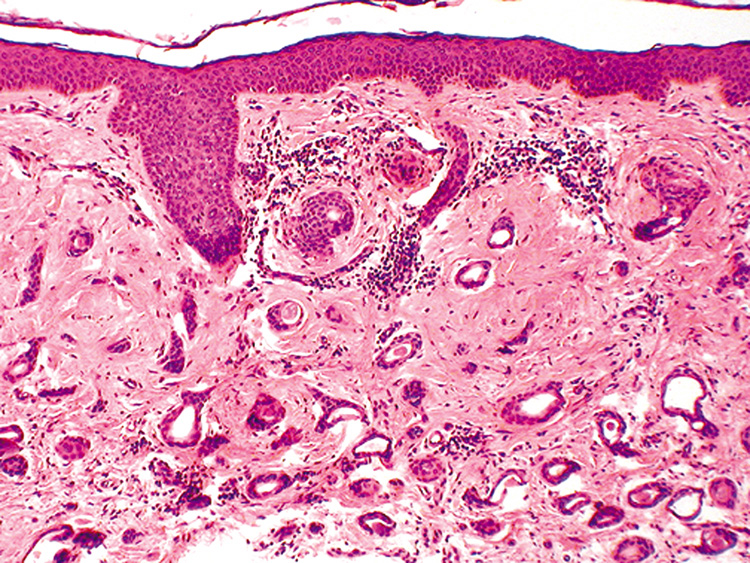 hairs. Biopsy demonstrates a minimal superficial perivascular lymphohistiocytic
