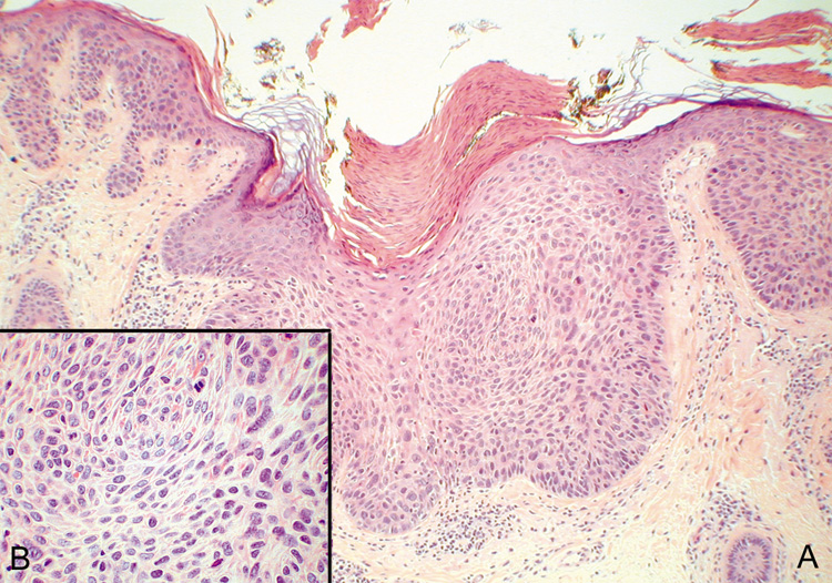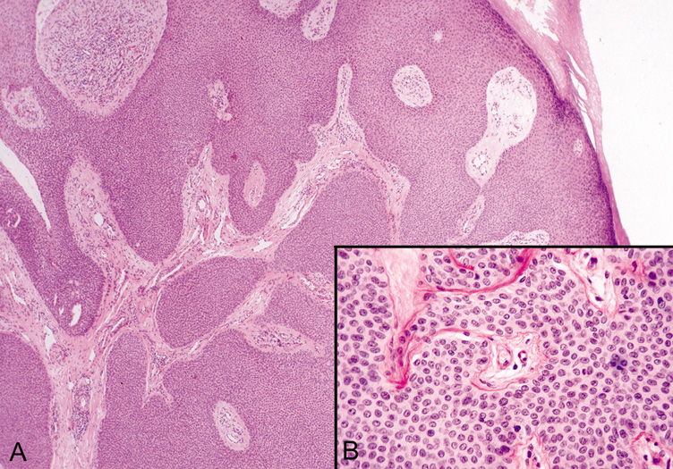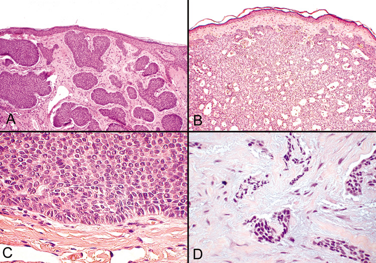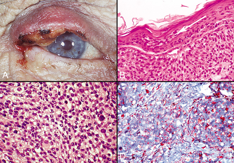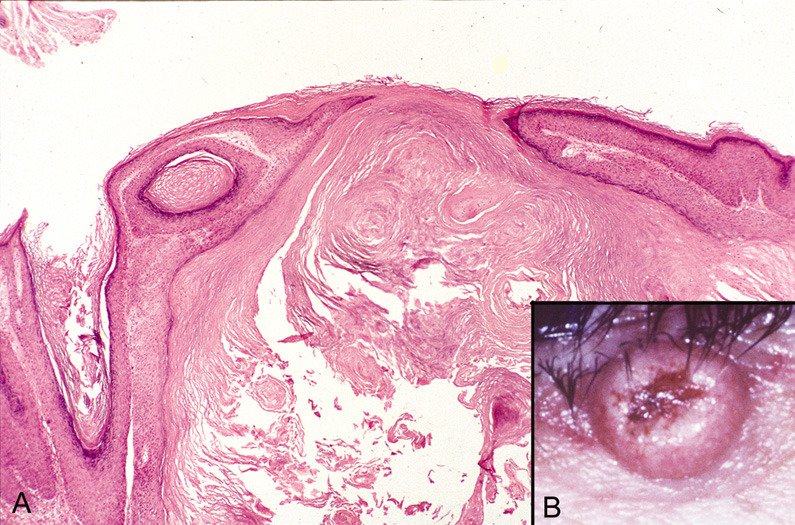 Syringocystadenoma Papilliferum This tumor occurs primarily on the scalp or face and usually is noted at birth or early childhood. Clinically, the lesion consists of a papule or plaque that increases in size and becomes verrucous at puberty. Most syringocystadenomas develop within a preexisting nevus sebaceus. Histologically, the epidermis shows papillomatosis and cystic invaginations into the dermis. Papillary projections lined by two rows of glandular epithelium extend into the lower portion of the cystic spaces (Fig. 39). The luminal row of cells are columnar and may show decapitation secretion, whereas the inner row of cells are small and cuboidal. A characteristic feature of this tumor is a dense plasmacytic infiltrate in the stroma, especially the papillary projections. OTHER TUMORS Neurofibroma Neurofibromas are common benign tumors of the skin, which may be solitary or multiple. Multiple neurofibromas are associated with café au lait macules in the skin and, in von Recklinghausen's disease, Lisch nodules in the iris. Clinically, the lesions are soft, flesh colored, and pedunculated. Plexiform neurofibromas are typically found on the upper lids and are clinically described as having a “bag of worms“ consistency (Fig. 40). Histologically, the tumors are well circumscribed but not encapsulated and may extend into the subcutaneous fat. The nuclei are elongated and wavy and show tapering at their ends. They are embedded in loose, delicate collagen fibers. The stroma is pale and may show significant mucoid degeneration. Mast cells are present in considerable numbers. Dermatofibroma (Histiocytoma) Dermatofibromas are common fibrous tumors that most commonly occur on the extremities. They are firm, red-brown papules or nodules that are dome shaped or centrally depressed. Histologically, the lesions are divided into two types, although they tend to overlap in many instances. The fibrous type is composed of cells resembling fibroblasts embedded in intertwining and anastomosing bands of collagen that blend imperceptibly into the surrounding dermis. The cellular type consists predominantly of cells with round-to-oval nuclei and abundant cytoplasm resembling histiocytes. In both types, scattered small capillaries are present but may be numerous and associated with hemorrhage and hemosiderin deposition. Vascular Tumors Several vascular tumors may occur on the skin around the eye, including benign lesions, such as hemangiomas (Fig. 41), pyogenic granulomas, spider nevi, venous lakes, and port wine stains, as well as malignant lesions, such as Kaposi's sarcoma and angiosarcoma. PREMALIGNANT TUMORS Actinic Keratosis Actinic keratoses occur on areas of chronically sun-exposed skin and are more likely to develop in individuals with a fair complexion. They are the most common premalignant skin lesion in adults. The risk of malignant transformation is thought to be 0.25% per lesion per year. Clinically, lesions are minimally elevated, slightly scaly, and flesh colored to pink. A cutaneous horn may overlie an actinic keratosis but also may overlie other lesions, such as verrucae and seborrheic keratoses. Histologically, the characteristic findings are focal-to-confluent parakeratosis overlying an epidermis of variable thickness. There is atypia and mitoses of the lower epidermal layers, with the formation of buds extending into the superficial dermis. The dermis shows solar elastosis and a patchy inflammatory infiltrate (Fig. 42). Squamous Cell Carcinoma In Situ When epidermal atypia becomes full thickness, the clinical lesion is more indurated than actinic keratosis and becomes a plaque. Squamous cell carcinoma in situ may arise on sun-exposed skin from an actinic keratosis or de novo on sun-protected skin. The latter lesion is referred to as Bowen's disease. Squamous cell carcinoma in situ may enlarge slowly for many years or may invade the dermis. Histologically, the epidermis is replaced by an atypical proliferation of keratinocytes showing nuclear hyperchromatism and pleomorphism. There are many dyskeratotic cells and mitotic figures, some of which may be atypical (Fig. 43). The overlying stratum corneum is parakeratotic. If occurring on sun-exposed skin, there will be solar elastosis. MALIGNANT TUMORS Epithelial Tumors BASAL CELL CARCINOMA. There are over a million new cases of nonmelanoma skin cancer diagnosed each year, of which more than 75% are basal cell carcinomas. Basal cell carcinoma is the most common malignant tumor of the eyelids (85–95% of all malignant eyelid tumors), occurring most frequently on the inner portion of the lower eyelid, followed by the medial canthus, upper eyelid, and lateral canthus. There is an equal sex distribution; most tumors occur in the elderly White patient population. The clinical appearance varies, but the most common clinical presentation is a shiny, waxy papule with a rolled border and telangiectasia. Ulceration and pigmentation may or may not occur. Basal cell carcinomas are slow growing, locally invasive, and, rarely, metastasize (Fig. 44). Histologically, tumors can be classified into one of three types: nodular, superficial, and morpheaform. Nodular basal cell carcinoma is the most common type and consists of small, medium, or large cell islands that resemble the basal cell of the epidermis. The tumor cells are characterized by large, oval, or elongated nuclei and contain little cytoplasm. The nuclei, as a rule, have a rather uniform appearance, do not show a pronounced variation in size or staining intensity, and do not demonstrate atypical mitoses (Fig. 45A-C). A helpful diagnostic feature is that nuclei of the peripheral cell layer of the tumor masses have a palisading arrangement. The stroma surrounding the tumor islands is mucinous, and spaces or lucunae form between the tumor and its stroma. In some cases, central necrosis may develop within the tumor islands forming cystic spaces. Other variants of nodular basal cell carcinoma include k