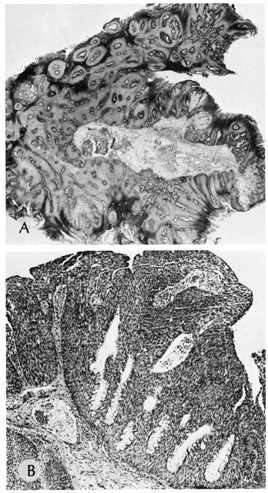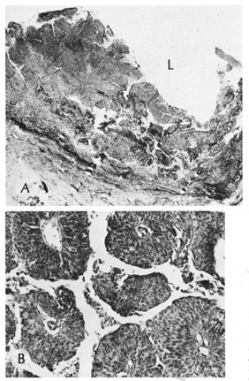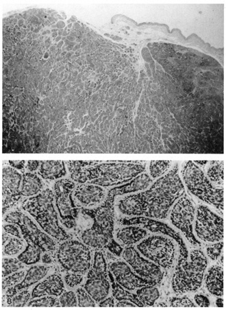 TUMORS Epithelial Tumors The epithelial lining of the lacrimal sac is the same as the rest of the upper respiratory tract (i.e., pseudostratified columnar epithelium). Therefore, tumors are similar to those found elsewhere in the upper respiratory tract, namely papillomas, squamous cell carcinomas, transitional cell carcinomas, and adenocarcinomas. Tumors of the lacrimal sac, however, are relatively rare. They generally cause early symptoms of epiphora, and, upon irrigation, blood may reflux from the punctum. Overlying skin ulceration or telangiectasias may also be associated with lacrimal sac tumors. Papillomas may be squamous, transitional, or adenomatous (Fig. 54). Rarely, a lacrimal sac papilloma may undergo oncocytic metaplasia (i.e., an eosinophilic cystadenoma or oncocytoma). The histology of squamous cell carcinomas is identical to that of those found elsewhere, and these carcinomas are the most common (Fig. 55). Transitional cell carcinomas are composed of transitional cell epithelium showing greater or lesser degrees of differentiation (Fig. 56). Adenocarcinomas are composed of malignant glandular elements. Melanocytic Melanocytic tumors arising from the lacrimal sac are quite rare and are identical histologically to those found in the lid. Mesenchymal The same mesenchymal tumors that involve the lids and orbit may involve the lacrimal sac. |