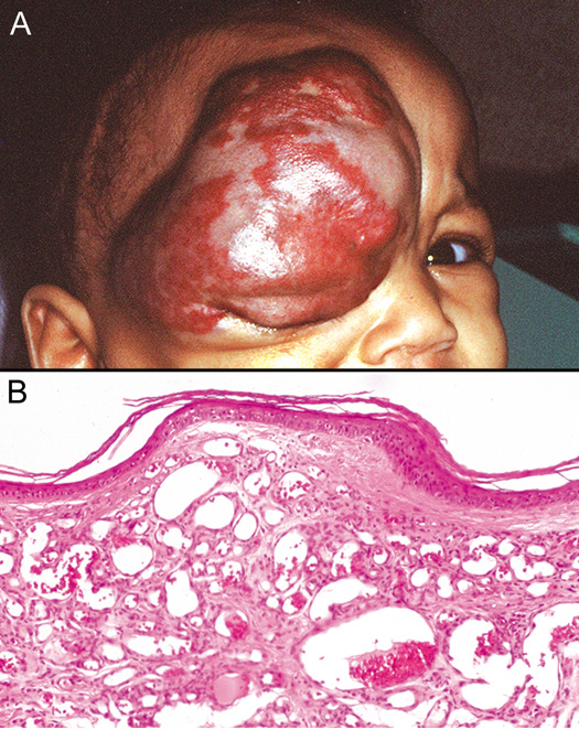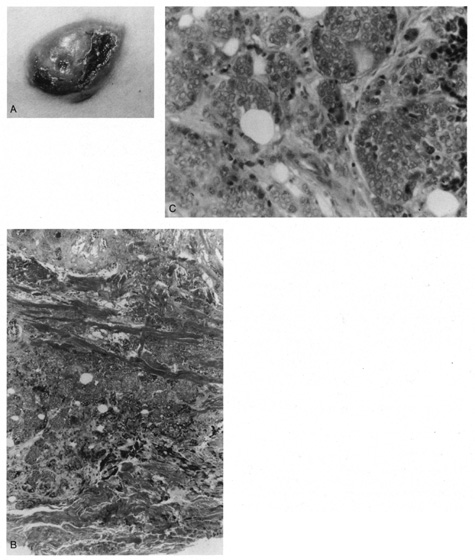 Angiosarcoma Cutaneous angiosarcoma most commonly arises on the face and scalp of the elderly. It may be misdiagnosed as a cellulitis or ecchymosis because of its asymptomatic benign appearance at presentation. Angiosarcoma of the face and scalp often invades locally and metastasizes diffusely. Histopathologically, there are atypical pleomorphic endothelial cells forming irregular vascular channels in the dermis. Mitotic figures are present, and the overall pattern of the tumor can range from well-differentiated epithelioid to a poorly differentiated spindle cell appearance. Immunohistochemistry using factor VIII-related antigen or Ulex europaeus 1 (UEA-1) will confirm its endothelial origin. Metastatic Carcinoma Skin metastases are uncommon and usually are seen as a late event in advanced cancer. Usually, by the time skin metastases are noticed, the tumor is widely disseminated. Most metastases to the skin occur in patients between 50 and 70 years of age. In women, the most common skin metastases are from carcinoma of the breast; in men, cutaneous metastases from carcinoma of the lung and large intestine are most frequent. In one large series of 7518 patients, four of 13 patients with ocular malignancy had skin metastases. The histopathology of cutaneous metastasis simulates the primary tumor, especially in breast, renal, and colon carcinoma. In some cases, the tumor can be diagnosed only as a malignant squamous or adenoid proliferation, and clinical diagnosis must be deferred pending review of the histology of the primary tumor with or without immunohistochemistry or electron microscopy. |