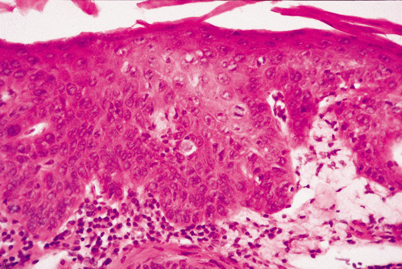 epidermis, vacuolar alteration at the dermoepidermal junction (tiny, oval, clear