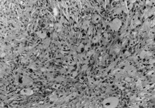 OTHER MALIGNANT TUMORS Merkel Cell Carcinoma The merkel cell is a distinctive, nondendritic epithelial clear cell believed to migrate from the neural crest to the epidermis. Merkel cell carcinoma typically arises on the head and neck of sun-exposed skin in elderly patients. The most common clinical appearance is that of a nonulcerated reddish-purple nodule that may persist for a few weeks to several years. Histologically, the tumor is purely dermal in location and is composed of sheets or trabeculae of monotonous small, round tumor cells (Fig. 51). The tumor cells show oval nuclei with inconspicuous nucleoli and abundant mitotic activity. Differentiation from lymphoma, oat cell carcinoma of the lung, and other metastatic undifferentiated tumors may be difficult. Immunohistochemistry and electron microscopy may be needed for a definitive diagnosis. Atypical Fibroxanthoma Atypical fibroxanthoma is regarded as a low-grade malignancy and is considered the superficial counterpart of malignant fibrous histiocytoma, which it resembles histologically. It has a more favorable prognosis than malignant fibrous histiocytoma, probably due to its small size and superficial location. Clinically, the lesions are nodules that may or may not ulcerate and occur on sun-exposed areas of the head and neck in elderly patients. Histologically, a dense infiltrate throughout the dermis may extend to the subcutaneous fat. The infiltrate is composed of cells with pleomorphic hyperchromatic nuclei in an irregular arrangement. Some cells are spindle shaped, whereas others appear polygonal with ample foamy vacuolated cytoplasm. The characteristic feature is the presence of large, bizarre, multinucleated giant cells showing marked nuclear atypia (Fig. 52). Numerous mitoses are present, many of which are atypical in appearance.