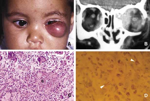 MICROBIAL INFLAMMATION Microbial infections of the orbit develop because of a variety of organisms, which are introduced to the orbit by different routes. Bacterial orbital infections are the most common that primarily originate from the paranasal sinuses and to a lesser degree, secondary to penetrating injuries with or without foreign bodies and rarely, secondary to endophthalmitis or systemic infectious process such as bacterial septicemia, tuberculosis, etc. The most common cause of bacterial orbital cellulitis is Staphylocci and Streptococci species. Although Haemophilus influenza was a common causative organism in children younger than 4 years of age, recent vaccination efforts have decreased the incidence of H. influenza cellulitis significantly.55 Anatomically speaking, if the infection is limited to anterior of the orbital septum, involving the eyelids it manifests itself primarily with lid and conjunctival edema and some venous congestion but not with proptosis.56 This process that is known as preseptal cellulitis is usually initiated with skin injuries or an upper respiratory tract infections in children. However, if the infectious process involves orbital soft tissues behind the septum, it is called orbital cellulitis (Fig. 6). Cellulitis usually develops secondary to a paranasal sinus disease, clinically associated with axial proptosis, marked chemosis, congestion of retinal veins, limitation of extraocular motility, and swelling and pain around the eye. Depending on the severity of the condition, vital structures within the orbit such as the globe and the optic nerve may be compressed or infiltrated by the infection. Generally, in children the orbital cellulitis originates from the ethmoid sinus and may limit itself to the subperiosteal site for a while and later spread into orbital soft tissues. Acute bacterial orbital cellulitis presents a nonspecific histopathology associated with diffuse polymorphonuclear infiltrate that may on occasion lead to abscess formation57 (Table 2). Subperiosteal and soft tissue abscesses may present with decreased vision, disc edema and increased intraorbital and intraocular pressures. Orbital abscess is best demonstrated with MRI. Emergent orbital exploration and the drainage of the abscess is indicated.