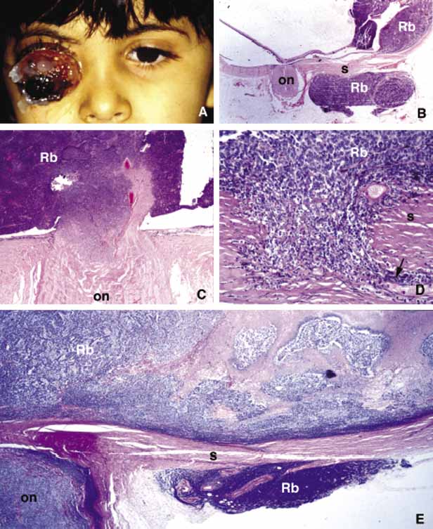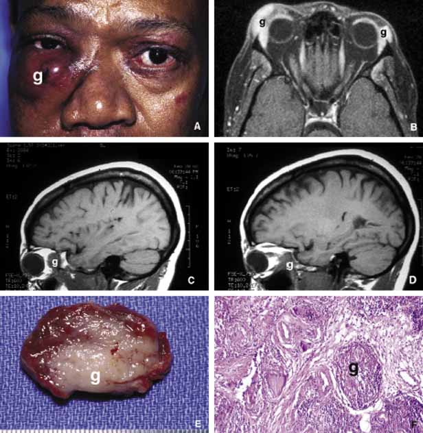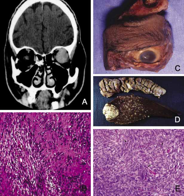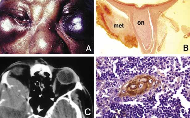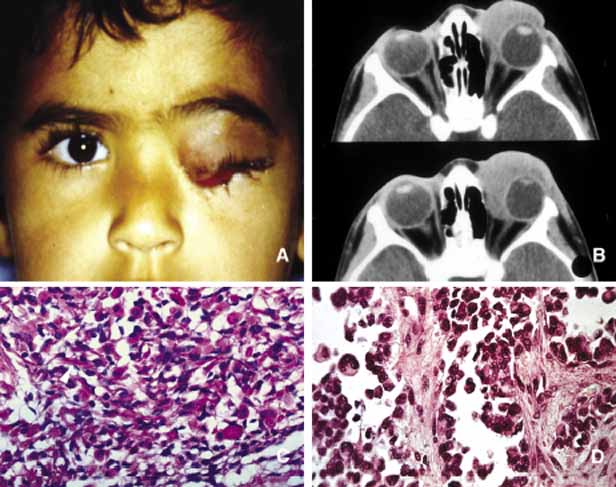 Patients with metastatic orbital tumors most frequently present with rapidly developing unilateral motility disturbance, painful proptosis, and, occasionally, a palpable mass.300,301 Imaging studies with CT and MRI provide information regarding the location of the tumor and the pattern of orbital involvement; however, they rarely offer any clues in terms of the primary site.302,303 Fine-needle aspiration biopsy (FNAB) is an effective method for histopathologic confirmation of orbital metastasis.304,305 In experienced hands, an adequate specimen is often obtained to provide material for routine, as well as special studies and the specimens should be evaluated by an experienced cytopathologist, knowledgeable in orbital diseases.306 False-negative results may be seen in tumors with prominent fibrous stromal reaction or hemorrhage, as well as in neoplasms that are surrounded with marked inflammatory response.307,308 Carcinoid tumors in the orbit may be primary or metastatic; the latter is reported to be a slowly growing circumscribed tumor with a long survival after surgical treatment.309,310 In approximately 10% of metastatic orbital tumors, the site of the primary lesion is unknown. This is a condition that is known as occult primary malignancy, in which the pathologist may play a pivotal role to identify the site of the primary neoplasm. For this purpose histochemical and immunohistochemical studies, polymerase chain reaction, chromosomal analysis, flow cytometry, and electromicroscopy may provide useful information in addition to the routine histopathological evaluation. In children, metastatic neoplasms to the orbit are predominated by small, round, blue-cell tumors, including neuroblastoma, Ewing sarcoma, granulocytic sarcoma, and Wilms tumor.311 Neuroblastoma is the commonest malignant tumor of infants, with an approximate incidence of 1 per 1000 live births, and it is the most common metastatic tumor to the orbit in this age group. Neuroblastoma is most often seen during the first year of life. As a matter of fact, it is the most common congenital neoplasm, which may be widely metastatic at birth, characteristically producing multiple subcutaneous and periocular metastatic lesions with ecchymosis (“blueberry muffin baby”).312 This tumor originates from primitive sympathicoblasts that normally would differentiate into ganglion cells. Microscopically it is made of round or oval, small round lymphocyte-like cells with hyperchromatic nuclei and minimal cytoplasm containing numerous mitotic figures (Fig. 33). Differentiating neuroblasts, ganglion cells, as well as rosette formations (Homer-Wright rosettes) may be seen in primary tumors. Once the tumor metastasizes, however, the features of neural differentiation are lost and it usually presents in the orbit with sheets of small, rounded cells.313 In these cases, ancillary techniques of histochemistry and immunohistochemistry may become valuable. Immunohistochemically, neuron-specific enolase (NSE) and S-100 neurofilament (NF) proteins are useful markers for neuroblastoma. Approximately 75% of the affected children excrete increased amounts of catacholomine byproducts, including vanillylmandelic acid (VNA), norepinephrine, homovanillic acid (HVA), and dopamine in the urine; this is very helpful in diagnosis. SECONDARY TUMORS Tumors extending or infiltrating into the orbit range from congenital malformations, hamartomatous and teratomatous lesions and reactive proliferations to highly malignant neoplasms such as retinoblastoma. The incidence of these lesions varies according to the definition of “tumors,” but they constitute approximately 10% of all orbital space-occupying lesions.314 Secondary orbital tumors may originate from the cranial bones and central nervous system tissues (meningioma, pituitary adenoma, craniopharyngioma),108,200,315,316 periorbital bones (osteoma and osteogenic sarcoma, giant cell-rich reactive lesions),276,277 paranasal sinuses and nasal cavity (squamous cell carcinoma),317 naso-lacrimal drainage apparatus (squamous cell carcinoma),318,319 globe, (uveal melanoma, retinoblastoma),320,321 (Fig. 34) and conjunctiva and the eyelids (squamous cell carcinoma, basal cell carcinoma, melanoma, and sebaceous gland carcinoma)314,320 (Fig. 35). As one can imagine, not only the histopathological features but also the clinical and radiologic manifestations vary, depending on the site of origin in the aforementioned secondary orbital tumors. |