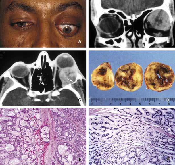 Many metastatic neoplasms originating from other organ systems may find their way to the orbit by hematogenous spread. The most common metastatic malignancies include breast, lung and kidney carcinomas, cutaneous melanoma and rarely sarcomas originating elsewhere in the body.160–162 Tumor-like conditions such as pseudotumors, granulomas, congenital lesions (hamartomas, choriostomas, etc.) that may also invade orbit secondarily are covered elsewhere in this chapter. Both the clinician who evaluates the patient with an orbital space occupying lesion and the pathologist who examines the tissue removed from an orbital mass, must have a working knowledge of the frequency of orbital neoplasms and tumor-like conditions163–166 (Table 4). More commonly encountered acquired orbital neoplasms are detailed. PRIMARY TUMORS Epithelial Neoplasms Primary epithelial neoplasms of the orbit originate from the ductal and acinar epithelium of the lacrimal gland.167,168 The most commonly encountered lacrimal gland tumor is pleomorphic adenoma (benign mixed tumor) (BMT). This neoplasm is known as a “mixed” tumor because it is composed of a mixture of epithelial and stromal elements (Fig. 14). The epithelial elements of the tumor consist of glandular and ductal formations that may develop squamous metaplasia and small keratin filled cysts. The stroma is composed of myxoid tissue that may contain cartilage and bone. In most cases the BMT of the lacrimal gland is multilobulated and surrounded by a fibrous capsule. If additional smaller lobules are present in the vicinity of the main lesion, these satellite nodules are individually encapsulated as well. When malignancy develops within a BMT it is classified according to its predominant histopathologic component as adenocarcinoma within pleomorphic adenoma, adenoid cystic carcinoma, or poorly differentiated carcinoma. Malignant transformation may happen as a rapid growth within an unknown tumor or may take place decades after diagnosis of the BMT.169 Adenoid cystic carcinoma, the most common malignant tumor of the lacrimal gland may also develop de novo. This is a highly malignant neoplasm that can be seen in adolescents and may develop rapid extension into the adjacent structures including the cranium by direct invasion and to the base of the skull by painful perineural invasion.170,171 The histopathologic appearance of adenoid cystic carcinoma may present as several variants including the most common “Swiss cheese” pattern that consists of cribriform clustering of small basophilic tumor cells surounded by thick basement membrane (Fig. 15). Other types including diffuse basaloid, sclerosing, tubular, and comedocarcinoma are known to exist.172 Both benign and malignant tumors of the lacrimal gland present with proptosis and inferior medial displacement of the globe that can readily be demonstrated on CT and MRI studies showing cavitation of the lacrimal fossa in chronic benign lesions and direct invasion of the bony tissues in malignant tumors. Adenocarcinoma developing in BMT (pleomorphic adenocarcinoma, malignant mixed tumor) presents with atypical features within tubular and glandular structures.169 Mucoepidermoid carcinoma of the lacrimal gland consists of diffuse proliferation of atypical squamous cells with abundant vacuolated cytoplasm containing mucin. The clinical course of mucoepidermoid carcinoma is chronic with a relatively favorable prognosis.173,174 Other than true neoplasms, cystic dilatation of the lacrimal gland ductules that is known as dacryops and ectopic lacrimal gland tissue presenting in areas away from the anatomic site of the gland also present as space occupying lesions in the lacrimal fossa.175–177 Mesenchymal Neoplasms The traditional grouping of the primary vascular tumors in the orbit include capillary and cavernous hemangiomas, lymphangioma and arteriovenous malformations. The current thinking is that these lesions represent hamartomas that are made of different tissue components and may be better defined as “vascular hamartomatous lesions.”178 Histopathologic examination of these tumors often reveals mixtures of above listed tissue elements, the symptomatology, clinical course and response to treatment depends on the predominating histopathology. For example, if capillary hemangioma is the dominating element of a vascular tumor it is most often apparent at birth or within the first year, occurs in the anterior orbit and gradually regresses without any treatment. 179 Approximately 70% of capillary hemangiomas regress completely by 7 years of age. Patients with orbital capillary hemangioma may also have similar lesions in other organs. If systemic involvement is extensive, secondary thrombocytopenia known as Kasabach-Merritt syndrome develops. These lesions grossly appear as bright red, strawberry-like masses; histopathologically they are made of sheets of vascular endothelial cells with small lumen formations. Basement membranes surrounding these cells can be clearly identified with a reticulin stain. The predominating cell of the lesion is confirmed to be endothelial cell, by the positive staining for factor VIII, CD31 and CD34. The identification of an intracytoplasmic organelle known as Wiebel-Palade body by transmission electron microscopy also confirms the nature of the tumor cell as vascular endothelium (Fig. 16). For adnexal and orbital capillary hemangioma the treatment options include observation, intralesional and systemic corticosteroids, systemic interferon and in some cases surgical excision and radiation therapy.180–182 Another type of orbital tumor that originates from blood vessels is hemangiopericytoma, which is a pseudoencapsulated spindle cell tumor composed of vascular pericytes183 (Fig. 17). In these tumors the reticulin network surround the individual tumor cells in hemangiopericytoma as opposed to small groups of epithelial cells in capillary hemangioma. In hemangiopericytoma the tumor cells 