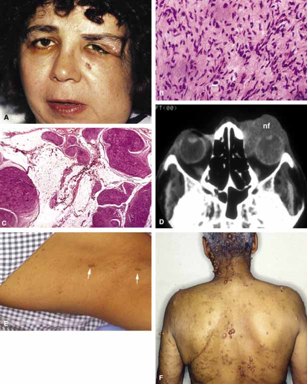 AMYLOIDOSIS Clinical features of orbital amyloidosis include proptosis and ocular motility disturbance and upper lid ptosis secondary to soft tissue infiltration322 (Fig. 36). The amyloid diseases are a diverse group of disorders, which can present as hereditary or sporadic forms. In these diseases, a hyaline material that is known as amyloid is deposited extracellularly in many tissues including fat, skeletal muscle, neural tissues, kidneys, adrenal glands, and, rarely, in the orbit.323 Orbital disease is manifested in most instances as a part of a systemic disorder such as multiple myeloma, rheumatoid arthritis, tuberculosis, etc.323,324 The most common types of amyloidosis are associated with multiple myeloma and primary amyloidoses. In plasma cell dyscrasias, a so-called protein AL is deposited in the affected tissues. In the primary amyloidosis, however, the deposited protein is known as AA, an amyloid derived from serum protein A and alpha-1 globulin. Both deposits AA and AP are insoluble, abnormal proteins and when they accumulate within the tissues, the normal architecture is distorted and thereby the tissue becomes dysfunctional. Under the light microscope the tissue deposits of amyloid appear as homogeneous, eosinophilic, hyaline material that stains orange/red with Congo-red technique and reveals a characteristic apple green birefringe under a polarizing filter. Amyloid deposits are also identified with crystal violet and thioflavin-T stains as well as with immunohistochemical stains that are specific for the AP and AA proteins.325 Ultrastructural examination reveals characteristic 6 to 10 nanometers branching fibrils arranged in a haphazard fashion without a distinct periodicity.326 In contrast with the systemic disease, focal amyloidosis in the orbit is a very rare disorder and may present as either a mass lesion or a diffuse infiltration involving fibroadipose tissues, lacrimal gland and/or extraocular muscles.327,328 The localized deposition of amyloid within the lacrimal gland presents with the enlargement of the gland, molding to adjacent structures and frequently with punctate calcification that is best depicted with CT.329 With MRI, amyloid deposits reveal low signal on T2-weighted images. With both CT and MRI, amyloid deposits demonstrate virtually no contrast enhancement with gadolinium.327 Extramedullary plasmacytomas occasionally may mimic amyloidosis when they are localized in the lacrimal and salivary glands.330 COLLAGEN TISSUE DISEASES Lupus erythematosus,331,332 dermatomyositis,333–335 rheumatoid arthritis,336,337 scleroderma,338–340 polyarteritis nodosa,342,343 angiolymphoid hyperplasia (Kimura disease),344–347 Behçet disease,348 and Churg-Strauss syndrome.349 are also known to involve orbit occasionally, and form diffuse and/or localized inflammation. ENOPHTHALMOS In great majority of orbital diseases, patients develop proptosis and displacement of the globe. It is important to remember, however, that in certain conditions the clinical presentation may be just the opposite, namely, the patient develops enophthalmos instead of exophthalmos.350,351 Enophthalmos (posterior/inferior dislocation of the globe) may occur with two basic mechanisms: structural abnormality, most commonly secondary to penetrating or nonpenetrating trauma with fractured orbital walls, and fibrosis of the orbital soft tissues, secondary to a number of pathological causes, including chronic inflammation, radiation degeneration, neoplasia, etc. The structural abnormality may also be related to a congenital malformation of the sphenoid bone in neurofibromatosis. If the bony defect is large enough, the globe may develop enophthalmos. Last but not least, orbital fibroadipose tissue may develop scarring and atrophy secondary to a number of diseases including scleroderma, radiation exposure, aging, and lipodystrophy.352 |