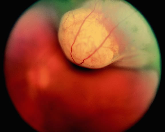 Necrotic melanomas may present with severe orbital and adnexal inflammation that can mimic infectious cellulitis or idiopathic orbital inflammation.48 Extensive necrosis typically is found in eyes with rapidly growing high-grade tumors. Marked elevation of intraocular pressure in eyes with secondary glaucoma may cause infarction of the tumor and other intraocular structures. Unsuspected melanomas occasionally are discovered when blind painful eyes with opaque media are examined pathologically. Before the advent of ultrasonography as many as 10% of blind painful eyes were said to harbor previously undiagnosed tumors.79 The possibility of a tumor should always be entertained when cataract is unilateral or asymmetric. It is quite embarrassing to diagnose a melanoma during cataract surgery. CLINICAL SIGNS. Ophthalmoscopic examination of a choroidal melanoma typically reveals a sessile or dome-shaped pigmented mass located deep to the retina (Figs. 16, 17, and 18). There often is an associated secondary nonrhegmatogenous serous detachment of the retina. Orange pigment may be located on the surface of smaller lesions.80,81 Tumors vary in pigment content and may be heavily pigmented or totally amelanotic. The differentiation of a totally amelanotic melanoma from uveal metastasis, hemangioma, lymphoma, or osteoma may be difficult. Compared with metastasis, melanoma usually is more highly elevated and drusen and RPE proliferation more evident on its surface. Ophthalmoscopy also typically shows well-defined vessels within melanoma.48 Ancillary studies such as fluorescein angiography and ultrasonography may be necessary to make the diagnosis.