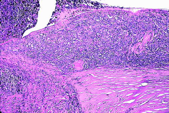 Iris melanoma is relatively rare, constituting between 4% to 15% of uveal melanomas in various series.93 The studies with higher reported incidences may reflect inclusion of nevi. Iris melanomas differ in some respects from tumors of the posterior segment. Most are low-grade spindle cell tumors (Fig. 43). However, iris melanomas with epithelioid cells occasionally are encountered (Fig. 44). Many pigmented iris tumors actually are nevi,94 and relatively few of these enlarge when observed. Several studies have shown that the risk of enlargement in 5 years is only 5% to 6% after a subset of promptly treated lesions is excluded.95,96 One study showed that iris tumors are likely to be considered melanomas and be treated promptly if the basal diameter is greater than 3 mm, pigment dispersion or prominent tumor vascularity are present, the intraocular pressure is elevated, or there are tumor-related symptoms.95 The mean age of patients with iris melanomas is about 10 years younger (age 43 years) than the age of patients with posterior segment melanomas.97 The prognosis of iris melanoma is also relatively favorable compared with tumors of the posterior segment. Shields and coworkers97 studied 169 patients with histologically confirmed iris melanoma and found that distant metastases developed in 5% at 10-years follow-up. The relatively small size of most iris melanomas probably is a major factor in their good prognosis. The prognosis of iris melanomas actually may be similar to posterior segment tumors of similar size and cell type. Diffuse iris melanomas that cause heterochromia iridis and secondary glaucoma are a rare but clinically important group of iris tumors.98,99 Many diffuse iris melanomas are higher grade tumors that contain epithelioid cells, which are poorly cohesive and prone to aqueous dispersal. Glaucoma surgery should be avoided in such cases. It invariably fails and puts patients at greater risk for extraocular extension and metastasis.100