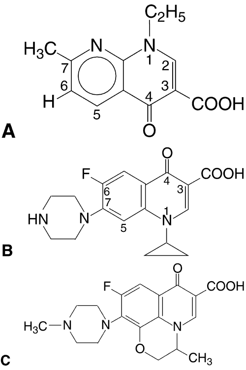 FLUOROQUINOLONES Chemistry, Ophthalmic Preparation, and Pharmacologic Action The fluoroquinolones, the newest class of agents to be developed, are based on the prototype, nalidixic acid (1,8-naphthyridine), which was synthesized in 1962.46 In the 1980s, the fluoroquinolones were created from nalidixic acid by adding a fluorine atom to position 6 of the molecule (Fig. 1). This addition widened the antibacterial spectrum of activity and resulted in decreased development of resistant organisms. Three fluoroquinolones available for ophthalmic use are ofloxacin (Ocuflox, Allergan, Inc, Irvine, CA), ciprofloxacin (Ciloxan, Alcon Laboratories, Inc, Fort Worth, TX), and norfloxacin (Chibroxin, Merck & Co, Inc, West Point, PA). They are formulated as 0.3% solutions and their structural formulas are shown in Figure 1.