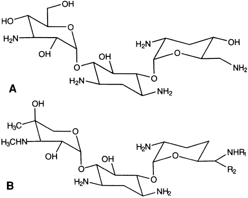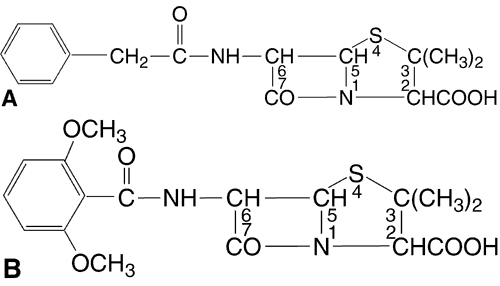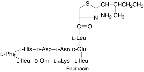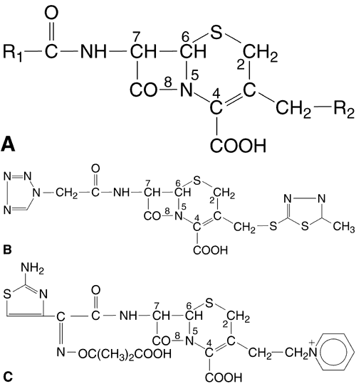 Clinical Experience and Ophthalmic Uses Bacitracin is efficacious against most gram-positive organisms and select gram-negative organisms, including penicillinase-producing staphylococci, Neisseria species, Haemophilus species, and Actinomyces species. Bacitracin penetrates an intact cornea poorly, but its penetration may be increased by a corneal epithelial defect.122 Adverse Effects Commercially available preparations and fortified dosages of bacitracin generally do not irritate the ocular surfaces. Hypersensitivity reactions, namely skin eruptions, have been reported. There is one report of an acute anaphylactic reaction associated with topical application of bacitracin.123 BETA-LACTAM ANTIBIOTICS Chemistry, Ophthalmic Preparation, and Pharmacologic Action This class of antibiotics includes the penicillins and cephalosporins. Penicillins (Fig. 4) are composed of a thiazolidine ring connected to a beta-lactam ring to which a side chain is connected. The side chain is responsible for the individual characteristics of the penicillins. Like the penicillins, the cephalosporins (Fig. 5) contain a beta-lactam ring, are bactericidal, and inhibit cell wall synthesis. By preventing the synthesis of polysaccharides needed for bacterial cell wall structure, they cause bacterial death. They tend to be more active against gram-positive organisms, with increased gram-negative activity in the extended-spectrum penicillins and the second- and third-generation cephalosporins. Bacteria become resistant to penicillins by producing beta-lactamase; cephalosporins tend to be resistant to degradation by beta-lactamase. All methicillin-resistant S. aureus and enterococci are also resistant to cephalosporins. Approximately 10% of patients allergic to penicillin will also be allergic to cephalosporins.