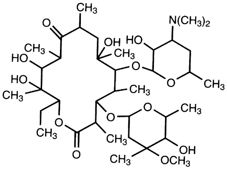 Chloramphenicol inhibits bacterial protein synthesis by binding to the 50S ribosomal subunit. It is primarily bacteriostatic but may be bactericidal to some organisms (e.g., H. influenzae). Clinical Experience and Ophthalmic Uses Chloramphenicol has good antimicrobial activity against most gram-positive ocular isolates and limited gram-negative coverage. Chloramphenicol should not be used to treat infections in which gram-negative bacteria, especially Pseudomonas or Serratia species131 are suspected. Because it is usually bacteriostatic, not bacteriocidal, and because of its limited spectrum, chloramphenicol should not be used in vision-threatening circumstances. In some studies, chloramphenicol has been shown to be as effective as ciprofloxacin, norfloxacin, and trimethoprim-polymyxin B in the treatment of bacterial conjunctivitis.79,132,133 Adverse Effects Much has been written about a possible link between topical ophthalmic use of chloramphenicol and aplastic anemia. Oral chloramphenicol can affect the bone marrow in two ways; one is a dose-related, reversible bone marrow suppression and the other is an idiopathic, usually lethal effect. Topical chloramphenicol has been associated with dose-related and idiopathic bone marrow suppressions.134–140 Chloramphenicol should best not be used in patients who have a family history of drug-related bone-marrow failure.141,142 Concern about the risk of aplastic anemia and the development of more effective antibiotics have been sufficient to drastically reduce the use of chloramphenicol in the United States, although it is still widely used in other countries. Burning may occur with topical instillation of chloramphenicol, but it is relatively nonirritating to ocular structures and allergic reactions are uncommon. ERYTHROMYCIN Chemistry, Ophthalmic Preparation, and Pharmacologic Action Erythromycin 0.5% is a macrolide antibiotic (Fig. 7) that inhibits bacterial protein synthesis by irreversibly binding to the 50S ribosomal subunit.143 It is bacteriostatic in low concentrations but can be bactericidal in high concentrations. Other determinants of its bactericidal activity include organism susceptibility, growth rate of the bacteria, and pH.144 Erythromycin is available in ointment form (0.5%) for topical ophthalmic use (Ak-mycin, Ilotycin).