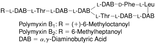 Clinical Experience and Ophthalmic Uses Erythromycin is used as prophylaxis against neo-natal conjunctivitis caused by C. trachomatis andN. gonorrhoeae. It is also used to treat mild bacterial conjunctivitis. It has a broad spectrum of antibacterial activity145 and is well tolerated by the ocular surface, but many resistant strains have developed. For example, several strains of H. influenzae, one of the most common pathogens in pediatric conjunctivitis, are resistant to erythromycin. Therefore, its usefulness in the treatment of external ocular infections is limited. Adverse Effects Topical application of erythromycin is not usually irritating to ocular tissues. POLYMYXIN AND COMBINATION PRODUCTS Chemistry, Ophthalmic Preparation, and Pharmacologic Action Many of the combination products currently available in the United States contain polymyxin B sulfate (Fig. 8). It provides efficacy against commonly encountered gram-negative pathogens such asH. influenzae. Polymyxin is a bactericidal polypeptide antibiotic that interferes with cell wall synthesis and forms false pores in bacterial cell membranes. It is less effective against Proteus, Providencia, Serratia, and Brucella species. It came into use in ophthalmology in the 1950s, when it was shown that polymyxin was effective in treating Pseudomonas corneal ulcers in rabbits.146 The effectiveness of this agent was then shown in treating human corneal ulcers infected with Pseudomonas species.147,148