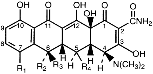 Clinical Experience and Ophthalmic Uses Sulphonamides were used in the treatment of external ocular infections before the need to perform efficacy studies. It is difficult to find documentation of their value in the medical literature. In a study of 158 cases of culture-positive pediatric conjunctivitis, topical sulfacetamide was found to be equivalent in efficacy to trimethoprim-polymyxin B and gentamicin sulfate solutions.154 Like erythromycin, sulfacetamides have a broad spectrum of antibacterial activity, but many strains of resistant bacteria have developed. Sulfacetamide is still effective against H. influenzae but is ineffective against many staphylococcal isolates, S. marcescens, and P. aeruginosa, which makes it a poor choice as a first-line treatment for bacterial keratitis.155 It remains a drug of choice for the treatment of Nocardia species.156 Adverse Effects Topical sulfacetamide is generally well tolerated. However, there is a small but significant risk of Stevens-Johnson syndrome associated with the use of topical sulfacetamide.157–159 TETRACYCLINES Chemistry, Ophthalmic Preparation, and Pharmacologic Action Tetracycline (Fig. 10) inhibits bacterial protein synthesis by binding to the 30S ribosome, and it is among the broadest spectrum agents available. For most organisms, tetracycline is bacteriostatic.