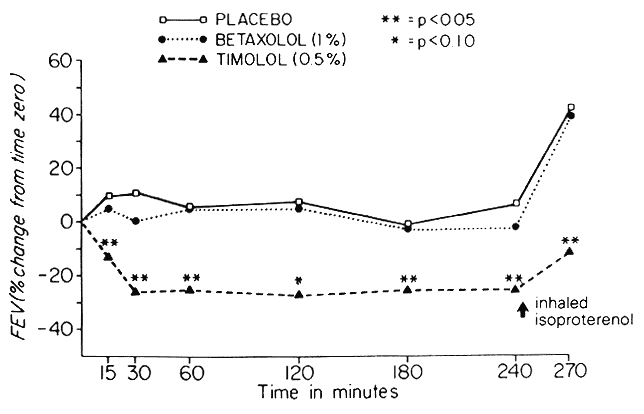 the highest, 34 ng/ml, was in a 3-week-old infant. Levobunolol, 0.5%, one drop bilaterally, produced detectable blood levels within 1 hour, at which time the mean plasma levels were 0.3 ng/ml. The highest plasma level was 1.1 ng/ml.7 These levels of ß-blockers are capable of producing pharmacologic effects. The ß-adrenergic stimulatory effects of intravenous isoproterenol are inhibited by plasma timolol levels well below 1 ng/ml.8,9 Isoproterenol was infused in healthy volunteers at increasing rates until the heart rate was raised 25 beats per minute above baseline. The isoproterenol infusion was then discontinued. A single dose of timolol 0.25 mg was then infused during a 15-minute period. Plasma timolol levels were 2.3 ± 0.4 ng/ml at the end of the infusion and 0.7 ± 0.1 and 0.4 ± 0.1 ng/ml at 1 and 4 hours, respectively. The isoproterenol infusions were repeated. Timolol decreased the sensitivity to isoproterenol. The dose of isoproterenol had to be increased 6.4 ± 1.2-fold at 1 hour and 3.9 ± 0.9-fold at 4.5 hours after timolol to achieve the same pulse rate elevation of 25 beats per minute. By Schild's equation (log of isoproterenol infusion plotted against the minus log of timolol plasma concentration), 0.17 ng of timolol per milliliter of plasma was the pA2 (i.e., the plasma level of timolol requiring a doubling of the amount of isoproterenol infused to produce the same response as in timolol's absence). |