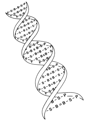 of DNA between daughter cells. DNA The structure of DNA is a double helix with four bases: adenine, guanine, cytosine, and thymine. These are paired by hydrogen bonds between the two helices like rungs in a ladder (Fig. 1). Each base is associated with a sugar and phosphate forming a nucleotide. The nucleotides are numbered in order, giving the DNA sequence. Nucleotides in the linear polymer chains that make up the two helices are connected by phosphodiester bonds. The sequence of bases (in nucleotide form), in groups of three called codons, makes up the genetic code. Each triplet codes for a specific amino acid. Since 64 different triplets are possible from the four bases, and there are only 20 amino acids, more than one triplet can code for a given amino acid.5 For example, the codon AAA will always and only produce the amino acid phenylalanine in the protein, but other codons may also produce phenylalanine in the protein. Amino acids are ultimately arranged into proteins, the building blocks of living structures.