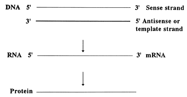 In 1911, Johannsen coined the term “gene” as the basic unit of hereditary characteristics.6 In 1901, the monk Gregor Mendel described the dominant and recessive patterns by which some traits are inherited, leading to the term Mendelian inheritance.7 Garrod developed the concept of human biochemical disease (i.e., inborn errors of metabolism) and its inheritance in a recessive Mendelian fashion in 1908 and8,9 Genes are arranged into coding sequences, called exons, and intervening sequences that do not code, called introns. In addition, there may be separate promoter regions. Only 3% to 5% of human DNA codes for proteins; the rest has no known function.10 Although variation (mutation) in exons is likely to cause disease and is therefore rare, variation in introns does not cause a problem, yet is inherited in a Mendelian fashion. Since these variations are benign, they are also plentiful and vary from family to family. These variations are therefore used as genetic markers (e.g., in linkage analysis). DNA sequences are written in a 5' to 3' direction (Fig. 2), and the sequence given is for the sense strand. The other strand is complementary and is called the template strand or antisense strand and runs in the opposite direction.10 DNA is transcribed in the following manner: