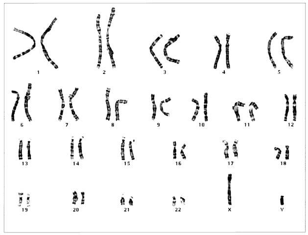 DNA replicates itself in an analogous fashion. The two helical strands separate, and each is copied by a series of enzymes that position a complementary base opposite each base in the strand of DNA. One double helix thereby gives rise to two identical double helices. Humans have approximately 2 m of DNA arranged into 46 chromosomes composed of 23 homologous pairs. This includes 44 autosomes, which are the same in males and females, plus either an XY in males (the Y chromosome determines testis development) or an XX in females (Fig. 3). Each member of a homologous pair carries corresponding, although not necessarily identical, genes in the same sequence. One member of each chromosome pair is inherited from the father, the other from the mother. For most of the cell cycle, each chromosome exists as a single chromatid. When a cell is committed to division, however, each chromatid is replicated. This is the form in which we usually see pictures of chromosomes: two identical sister chromatids joined at a centromere, making an “X” shape.