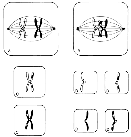 Each somatic cell has 46 chromosomes and divides by mitosis, which results in daughter cells with 46 chromosomes (Fig. 4). Mitosis gives rise to the body cells needed for growth and development. The normal sperm or ova, however, are the result of division by meiosis (Fig. 5) and have 23 chromosomes each, only one from each chromosome pair. In this manner, each parent passes on half of his or her genetic information to each child. Interestingly, the drive toward genetic diversity is so great that it can be seen even within a single sperm or egg. Each parent has two copies of every chromosome and passes on only one. However, the version of each chromosome that is passed on is not identical to either of the copies that the parent possesses. During meiosis, before the two copies of each chromosome separate to go to different eggs or sperm, the homologous chromosomes exchange genetic material in a process called crossing over (see Fig. 5B). At this stage, each homologue is made of two identical sister chromatids joined at the centromere. A crossover involves an exchange of genetic material between two chromatids on two different homologues. For example, a person has one copy of chromosome 1 from her mother and another copy from her father. Assume that she has brown eyes and is esotropic. Assume hypothetically that an esotropia gene is present on the maternal chromosome 1 as well as a gene for brown eyes. On the paternal chromosome 1 are genes for straight eyes, color blue. We might expect that in meiosis, when one copy of each chromosome goes to each egg, that the resultant eggs would all have either the maternally derived chromosome 1 with brown eyes and esotropia or the paternal straight blue. In fact, however, crossing over exchanges material between this person's two copies of chromosome 1, making unique versions to be passed on: very possibly esotropia with blue eyes or straight brown eyes. The chance that traits will be separated by crossovers increases as their genetic distance from each other increases. Many crossovers may occur involving one, two, three, or four arms. In human male meiosis, an average of 55 crossovers occurs, with at least 1 crossover per homologous pair. Crossovers in females are even more frequent.10 Thus, the version of chromosome 1 passed on by a parent is actually an amalgam of different pieces from each of his or her two different chromosome 1 copies. This is important to understand because in some families, diseases caused by mutations in genes that are physically close together on the chromosome may occur together in some family members, whereas others may have only one trait or the other. It is also vital to understand crossing over because it plays an important role in understanding linkage analysis. At conception, a sperm and ovum unite to form a zygote, which reestablishes the 46-chromosome complement. These chromosomes represent a random assortment of the genetic information present in each parent, in a unique combination that allows for advantageous new gene interactions in the offspring. Conversely, it may bring together genes that add to each other in a negative way, producing what we know as human malformation or disease. In addition, with such a complex process it is understandable that “mistakes” sometimes occur: chromosome pairs may not completely separate during meiosis, leading to extra genetic material in the offspring called trisomies or rearrangements called translocations. Trisomies occur with increased frequency as maternal age increases; mutations occur with increased frequency as paternal age increases. Pieces of DNA may be lost (deleted), or one or more bases may not pair up normally, changing a codon (mutations). These occurrences are not rare, and often result in early miscarriages. Although they are genetic in nature, they may or may not be inherited or heritable; it may be a chance occurrence without increased risk of recurrence. A mutation is a stable, heritable alteration in DNA transmitted from parent to progeny.11 From an evolutionary standpoint, mutations are necessary to generate genetic diversity, which makes adaptation to differing environments possible. While some mutations cause disease, others contribute to success and survival of the fittest. Some mutations do both: when one of a person's two homologous hemoglobin genes carries a sickle mutation, the person is resistant to malaria. Thus, this particular mutation protects persons who live in areas in which malaria is endemic, and it has been passed on to large numbers of progeny in some populations. If a person carries two copies of the sickle mutation, however, sickle cell anemia results, which is associated with high morbidity and mortality. |