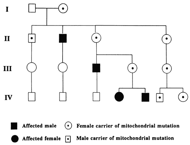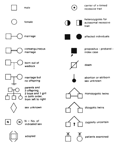 are not asked, valuable information will be lost. Even a brief family history should be put in pedigree form using standard symbols for clarity (Fig. 6). Questioning should begin with names, ages, and genders of parents, siblings, and children of the proband (the person presenting for care). Initial questions should be general, and the type of questions to ask are common sense: Does anyone else in your family have the same problem? Such general questions should be part of every eye examination. A routine cataract patient with multiple family members who have suffered retinal detachments is no longer routine. A young patient with borderline high intraocular pressure and cup-to-disc ratio of 0.60 needs to be followed far more closely if several relatives are blind as a result of glaucoma. A child who is found to be myopic will usually have relatives who wear glasses for driving or distance; if instead there is a history of night blindness, or family members who could not get a driver's license because of poor best-corrected vision, the diagnosis and prognosis change markedly. For patients who clearly have a syndrome or severe genetic disorder, the family history becomes even more crucial. Diagnosis and recurrence risk, of paramount importance to most families, often are determined by the pedigree. Directed history taking is vital, with attention to symptoms or systemic problems that commonly occur as part of the suspected syndrome. Table 1 provides a list of questions that should be asked when taking a directed history. It is important to describe clinical signs in lay terms: patients may not know if anyone in the family had “nystagmus,” but will quickly remember an uncle with “jumping or jiggling eyes.” It is often useful to take an additional history on subsequent visits, since patients may talk to relatives and remember more details after the initial interview. It is imperative to ask specifically about associated systemic findings. The polydactyly of Bardet-Biedl syndrome often is ligated at birth. The infantile skin vesicles of incontinentia pigmenti resolve spontaneously, making the history—not the physical examination—the key to the diagnosis. Aortic aneurysms in relatives of patients with ectopia lentis, or recurrent miscarriages in a family with a child who has multiple congenital anomalies, may not seem relevant to the patient giving a history, but these may provide clues to the diagnosis. A history of consanguinity should be sought if a recessive disorder is suspected.