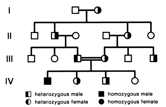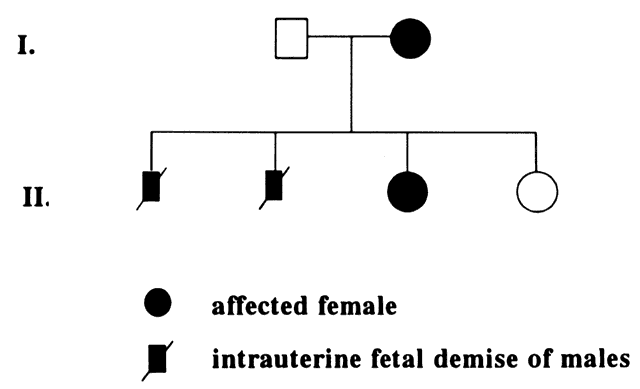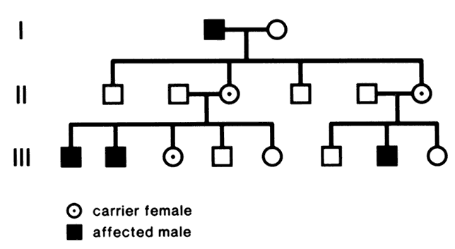 the mode of inheritance in a given family. AUTOSOMAL DOMINANT DISORDERS In dominant disorders, the disease trait is manifested when only one copy of the gene is abnormal. These disorders often are passed directly from parent to child through several generations, with examples of transmission to children of both sexes from parents of either sex, including male-to-male transmission (Fig. 7). The risk of having affected offspring is 50% for each offspring. Many parents interpret this to mean that one half of an affected person's children will be affected and half unaffected, and thus believe they are “safe” after having one or two affected children. It is important to clarify to these parents at the outset of the discussion that there is a 50/50 chance for each offspring to be affected. For example, each flip of a coin has a 50% chance of being “heads” and a 50% chance of being “tails,” but the order is random: only the final result after an infinite number of tosses results in one half of the tosses being heads and the other half tails. If neither parent is affected, the risk of each future child's being affected is usually very small, often not greater than the population risk. It should be noted, however, that some dominant disorders, such as coloboma or neurofibromatosis, have such variable expressivity that affected persons may not know they are affected. Dominant disorders often are caused by genes that code for structural proteins such that specific tissues are affected: for example, Stickler's syndrome in which mutations of COL2A1 make structurally abnormal collagen leading to abnormalities of the joint, palate, and face as well as abnormal vitreous, which predisposes the affected patient to myopia and retinal detachment.13,14 Often there is no family history. Remember: someone has to be the first to have a new mutation producing a dominant disorder and subsequently a pedigree. This person's father may have been advanced in age, which increases the risk of occurrence of a new dominant mutation. Dominant disorders often show great variability in expressivity of the trait. For example, coloboma may be autosomal dominant in 22% of cases15, but some members of the family may have only a small chorioretinal “scar” as their manifestation, whereas others may have coloboma of the iris, lens, retina, and choroid, causing microphthalmia and blindness. Some dominant disorders appear to skip generations; this is often dependent on the means used to diagnose the disorder. For example, Best's macular dystrophy may appear to be absent in the young children of a large pedigree with many affected members when diagnosed by ophthalmoscopy. But if an electro-oculogram is used as the diagnostic test, more affected patients, often young children, will be found who do not yet have visible retinal changes. In pedigrees with retinoblastoma, an abnormal copy of the Rb gene is transmitted as a dominant; however, for a person to be affected, a second somatic mutation must occur in that person. This second mutation occurs in approximately 90% of patients, but in 10% it does not, and no retinoblastoma develops. For example, a seemingly normal person who has an affected parent and an affected child is deemed “unaffected” by ophthalmoscopy, but DNA testing reveals the presence of the Rb mutation. What appeared to be a “skipped generation” was actually a fortunate lack of the second mutation needed for manifestation of the disease, although the inheritance pattern of the gene is dominant. In some autosomal-dominant and X-linked recessive disorders, there is a phenomenon called anticipation. This means the manifestations of the disease seem to worsen in succeeding generations. An example of this is olivopontocerebellar atrophy, in which a parent may have late-onset, mild cerebellar symptoms and slowly progressive macular degeneration, while his or her child develops complete blindness and becomes wheelchair-bound at an early age. Some cases of apparent anticipation may be due to ascertainment. That is, once it is known that an inherited disorder runs in the family, everyone is more aware of symptoms, children are diagnosed at an earlier age, and they are diagnosed correctly. In some cases, however, anticipation is due to expansion of abnormal sequences of DNA; once these sequences are already longer than normal, they are likely to become more mutated with succeeding generations. This phenomenon has been well described in the Fragile X Syndrome, an important cause of inherited mental retardation in males. X-linked dominant disorders are very rare, but do exist. In these disorders the genetic abnormality in a gene on the X chromosome is so severe that even the presence of a normal X in females cannot protect from its effects and females are severely affected. Males, who have no normal activity of these presumably vital genes, cannot survive and usually die in utero (Fig. 10). Examples which may be seen in ophthalmologic practice include incontinentia pigmenti (IP) and perhaps Aicardi's syndrome. Patients with Aicardi syndrome usually represent new mutations, while IP is not infrequently present in the family, often with variable expressivity.