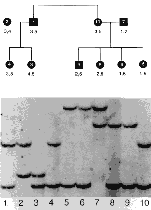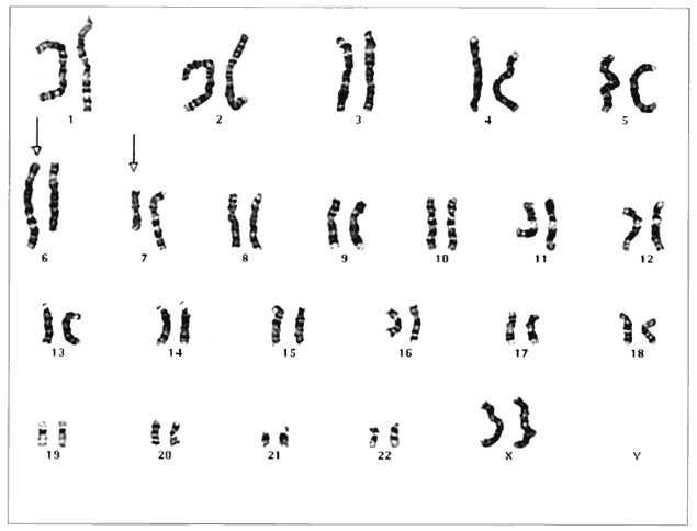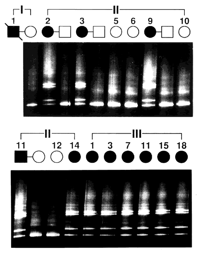 this admittedly complex and “high-tech” field. STEP 1. Develop a working diagnosis and as detailed a pedigree as possible. Like amniocentesis, which screens only for disorders for which an individual patient is at risk, a molecular genetic workup also must be directed toward “hot-spots” with the use of current techniques. Autosomal-dominant, X-linked recessive, and mitochondrial disorders are far easier to study than autosomal-recessive ones. Families with many affected members statistically are more powerful than singleton patients. Once a diagnosis and family survey have been done, ask yourself this question: Does this patient have an isolated disorder (e.g., autosomal-dominant coloboma), with effects only in the eye, or a syndrome (i.e., a multiorgan abnormality)? In a patient with significant congenital anomalies in two or more organ systems, a high-resolution banding karyotype should be considered (Fig. 12). In patients with sporadic (vs autosomal-dominant) aniridia, the chance of finding a detectable abnormality (usually a deletion in the short arm of chromosome 11), is also significant, especially if Wilms' tumor, growth retardation, or developmental delay are present. Children with retinoblastoma plus other systemic abnormalities may demonstrate deletions in the q arm of chromosome 13. In cases of isolated retinoblastoma, abnormalities are unlikely to be manifested on a high-resolution banding karyotype. Only large deletions, transpositions, and trisomies can be detected with this test; point mutations cannot. Thus, this test is indicated only if there are ocular abnormalities known to be associated with gross chromosomal structural changes, or if there are other congenital anomalies suggesting multiple abnormal genes. If a child has an abnormal karyotype, both parents' karyotypes should be examined even if the parents appear to be normal. Any patient suspected of having Down syndrome, Turner syndrome, or trisomy 13 should have a karyotype analysis. STEP 2. If the abnormality is isolated/subtle or the karyotype is normal, determine whether there is a candidate gene for the disorder. If the disorder obviously runs in the family, it is genetic. If there is only a singleton patient, a literature search may be done to determine whether inherited or genetic forms of the disorder have been described. Always remember that even in a dominant disorder there may be no family history: someone has to be the first new mutation to start the pedigree. If the gene is known (e.g., in ADRP, in which approximately 33% of patients are known to have mutations of the rhodopsin or peripherin genes; in Leber's hereditary optic neuropathy, in which most patients have one of three major mutations of mitochondrial DNA), a blood sample from one affected person may be sent to a laboratory that screens for that disorder using gene mutation analysis. Currently, most of these tests are being done on a research basis, each laboratory looking at a few specific disorders. If the index patient's DNA is negative for a mutation, the presence of a genetic disorder cannot be ruled out, since none of these tests is positive in all cases. By the same token, the presence of a mutation does not always prove causality. Many changes in DNA do not cause disease. These changes are called polymorphisms. To determine whether a mutation found in a patient with a given disease is a polymorphism or a disease-causing mutation, other family members—both affected and unaffected—must be tested. If the mutation does not change an amino acid in the final protein, it is not disease-causing. If the DNA change is found in all affected persons and never in unaffected persons, the likelihood that it is responsible for the disease is high. Statistical analysis can be done to determine whether the concordance between mutation and disease state is sufficient to prove causality. If only a singleton patient is available for study, and a mutation known to segregate with the disease is found in other families, causality can be assumed. In the case of a new mutation, however, if it changes both a conserved amino acid and the final protein, it is likely to cause disease, but in the absence of a known segregation of the mutation with the disease in a family, this cannot be proved. Once a mutation is found, gene sequencing is done to detect the exact abnormality. Figure 13 demonstrates the denaturing gradient gel method of screening for mutations in butterfly macular dystrophy, as well as the mutation segregating with the disease. STEP 3. If gene mutation analysis is negative, or a gene has not been identified for a specific patient's disorder, linkage analysis may be performed (Fig. 14). For disorders in which no gene has been implicated, linkage analysis uses genetic markers to determine the location of the gene. Genetic markers are patterns of DNA sequences with a known location on a chromosome, which are inherited in a Mendelian fashion. Linkage analysis works in the following way: first the entire family is typed at each marker as in Figure 14; then the inheritance of each marker is correlated with whether each individual is affected or unaffected. For purposes of discussion (please refer to Figure 14), assume persons 1 and 10 are both affected with an autosomal-dominant ocular disorder. Assume further that all of the children in the second generation are affected. In this scenario, we can see that all affected persons carry the No. 5 band, but neither of the unaffected spouses do. Thus, the disease may be close to this marker and may travel with it during DNA replication and division in meiosis. A statistical analysis can be done to determine the likelihood of this, called the LOD score. If the LOD score is -2 or more, the disease is very unlikely to be in the immediate vicinity of the marker. If it is + 3 or greater, it is very likely to be in the vicinity of the marker and therefore considered linked. Thus, in the above case, if we k