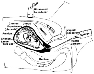 The procedure is performed under ultrasound guidance. After obtaining informed consent, an ultrasound examinations is performed to establish fetal viability, placental and fetal location, and depth to the largest pocket of amniotic fluid (Fig. 3). The maternal abdomen is prepped aseptically and a local anesthetic may be administered. A small gauge needle is then used to aspirate approximately 10 to 20 mL of amniotic fluid. The availability of the results is dependent on the amount of time needed for cell culture growth but usually is available within 7 to 10 days. The results received are a full cytogenic karyotype.