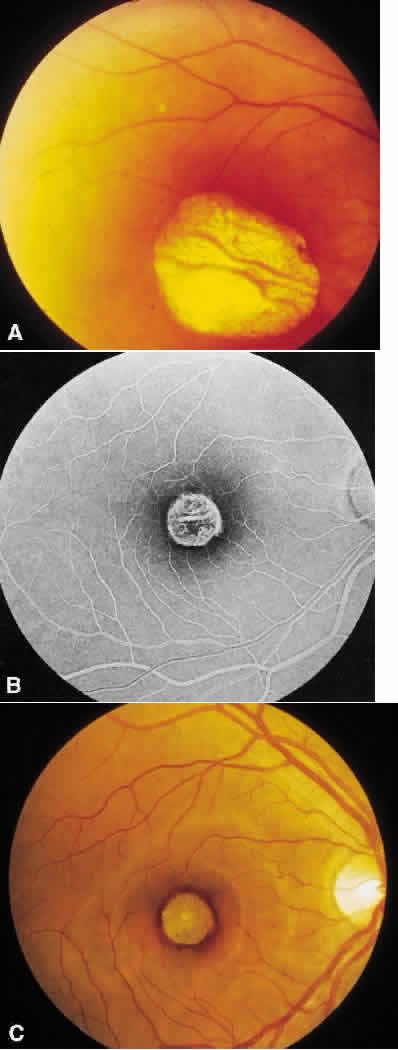 funduscopically (Fig. 5).66 With progression of the disease, the chorioretinal atrophy is obvious, and in the late stages, a few large choroidal vessels may be seen coursing over the white sclera. The yellowish appearance of these vessels prompted the conjecture that choroidal vas-cular “sclerosis” was the primary cause. However, histopathology has clearly shown no evidence of vessel wall sclerosis, but rather a well-delineated macular zone of atrophy of the choriocapillaris.67–70 In the early stages of central areolar choroidal dystrophy, the finding of nonspecific macular pigmentary abnormalities can mimic a variety of macular diseases (e.g., Stargardt's disease, vitelliform dystrophy, progressive cone dystrophy, and acquired macular degenerations). The later appearance of macular chorioretinal atrophy can also be mistaken for a healed chorioretinitis, atrophic nonexudative acquired macular degeneration, and the late stages of other hereditary dystrophies. Therefore, the diagnosis of central areolar choroidal dystrophy should be suspected when there is dominant inheritance with family members showing the various morphologic stages, bilateral symmetric macular lesions in all affected members without drusen or flecks, choriocapillaris atrophy on angiography of all affected members, and a normal ERG. |